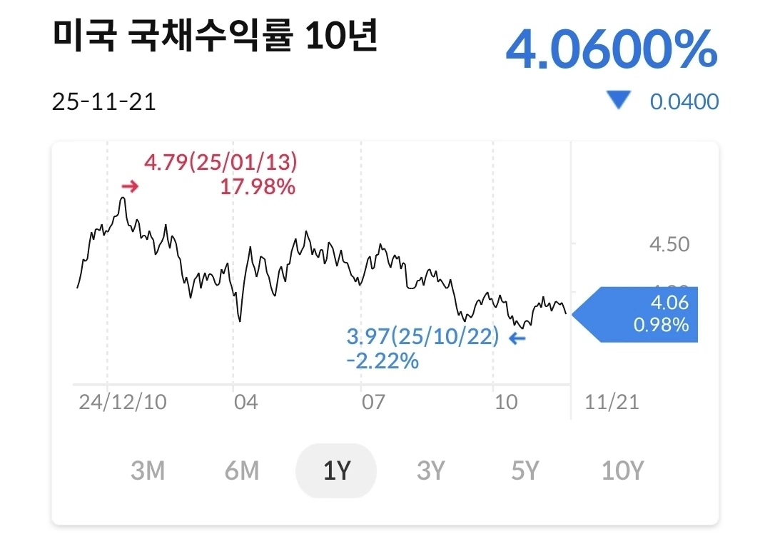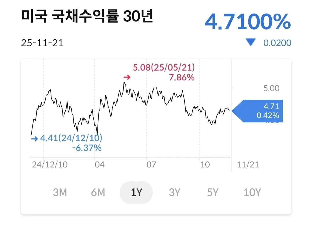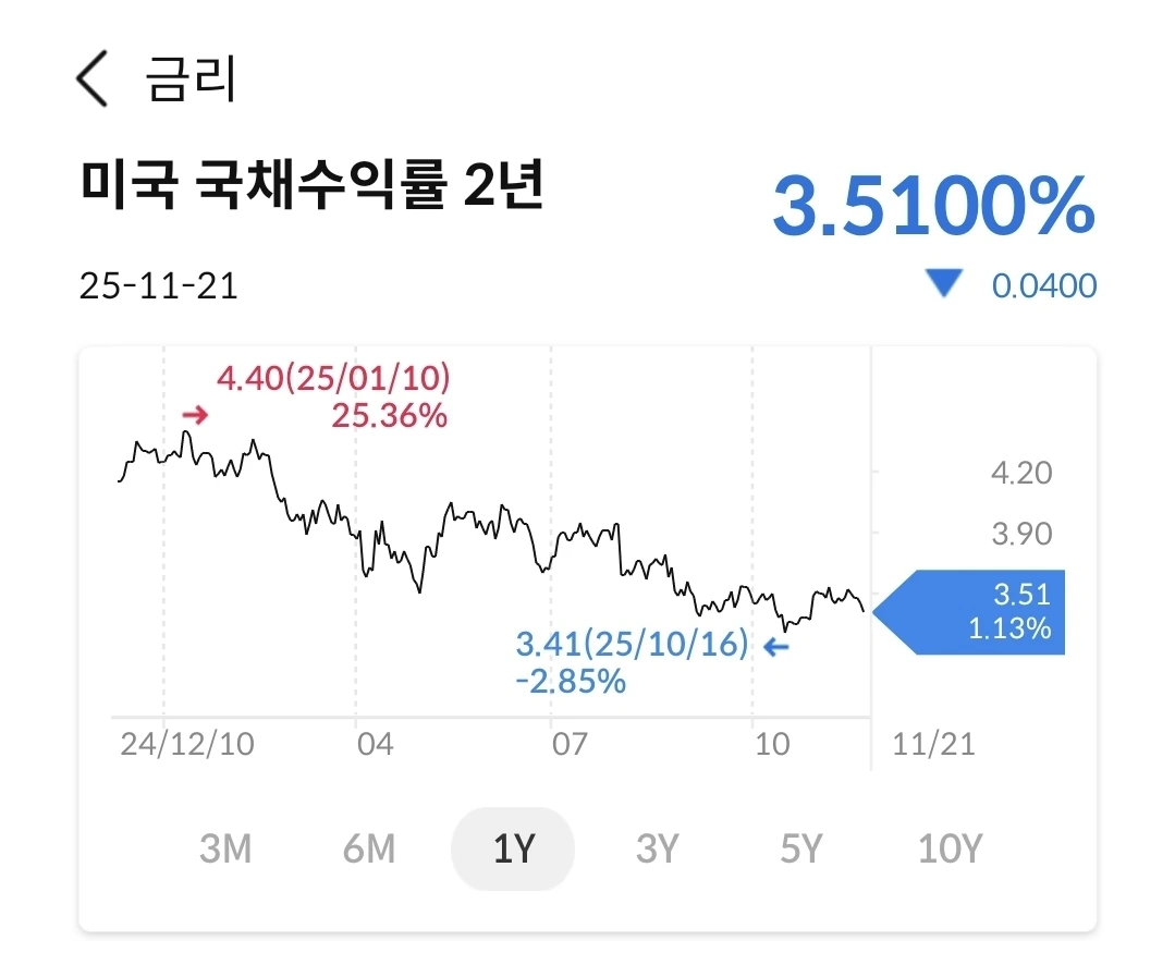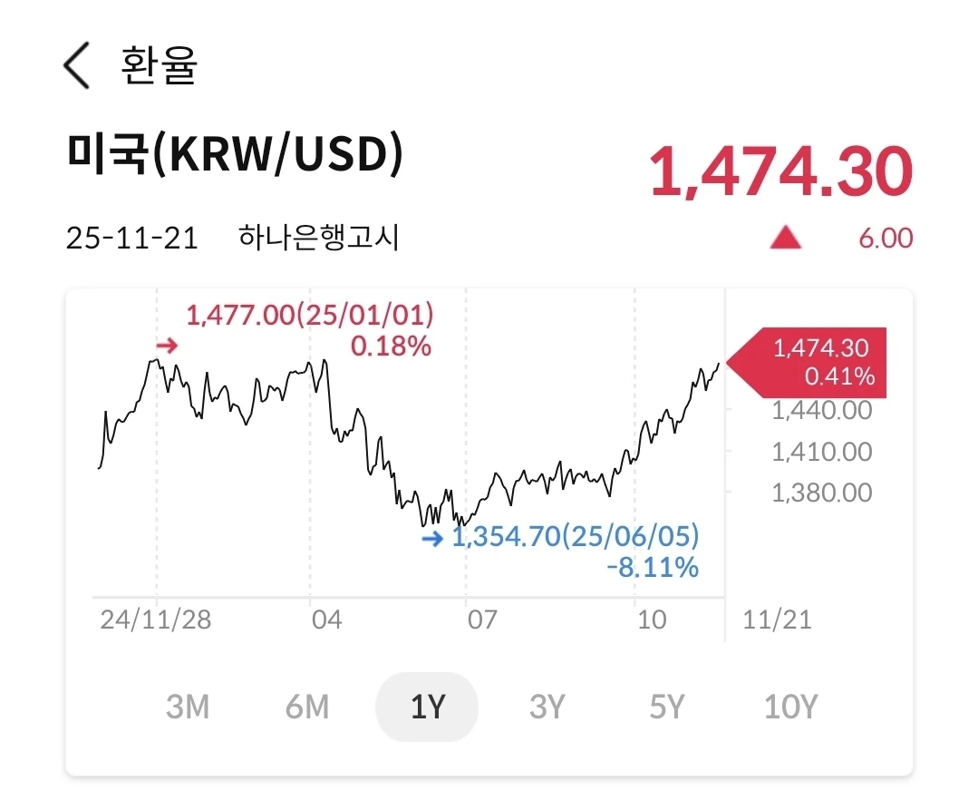 계엄했을 때와 동일한 수준으로 올라갔다. 원화의 가치가 가파르게 떨어지는 중이다. 여러가지 이유가 있겠지만 지금은 계엄만한 이슈가 있는 것도 아닌데 가치하락이 크게 늘어 나고 있다. 신문에서는 1500원이 노말이 될 수 있다는 이야기도 나온다. 미국 투자를 할려면 달러가 필요한데, 예전에 비해서 많은 원화가 필요하다. 금리인하가 되면 달러가 약세로 갈 것이기에 일단 어느 방향으로 금리가 움직일 지 보자.