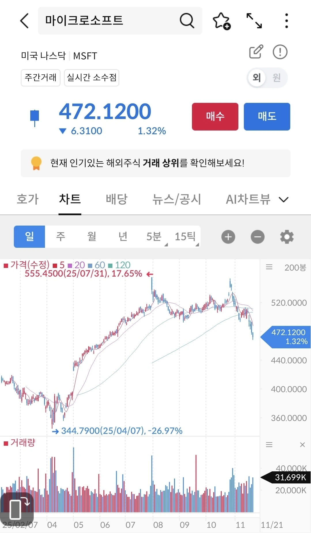 500불을 넘어간지 얼마 안되었는데 다시 400불대로 진입해서 우하향 중이다. 인공지능이 거품이라고 하면서 직격탄을 맞았다. 이제는 인공지능으로 실적이 나오는지 지켜볼려고 한다. 결국은 매출이 나오면서 다시 상승하지 않을까 생각한다. 지켜보자.