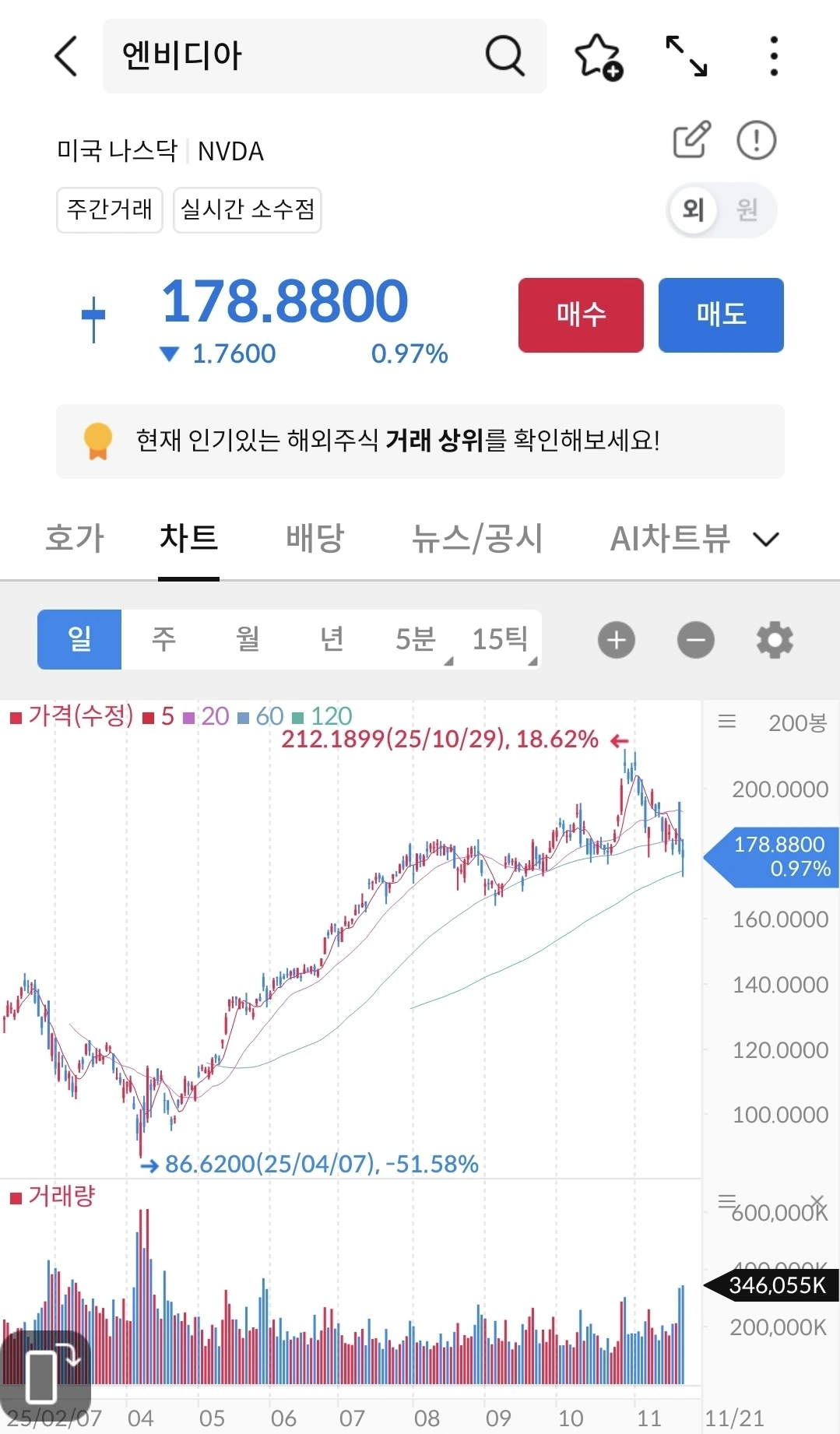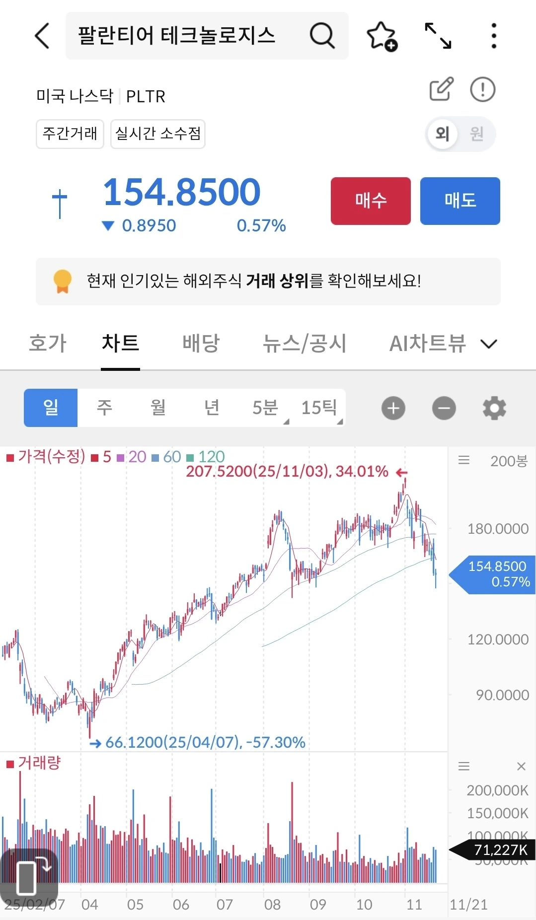 사상 최고의 실적을 내고 주가는 하락 중이다. 4분기에도 좋은 실적이 나올 것으로 예상되고 지금은 단기적인 하락이 아닐까? 금리동결이라는 뉴스에 기업 실적보다는 시장 내 이슈로 하락 중이다. 다시 상승할 날이 올 것이다. 지켜 보자.