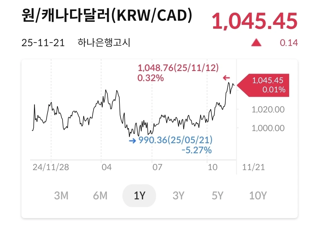 캐나다 달러도 점점 비싸지는 중이다. 전에 비해서 원화가 더 필요하다는 뜻이다.