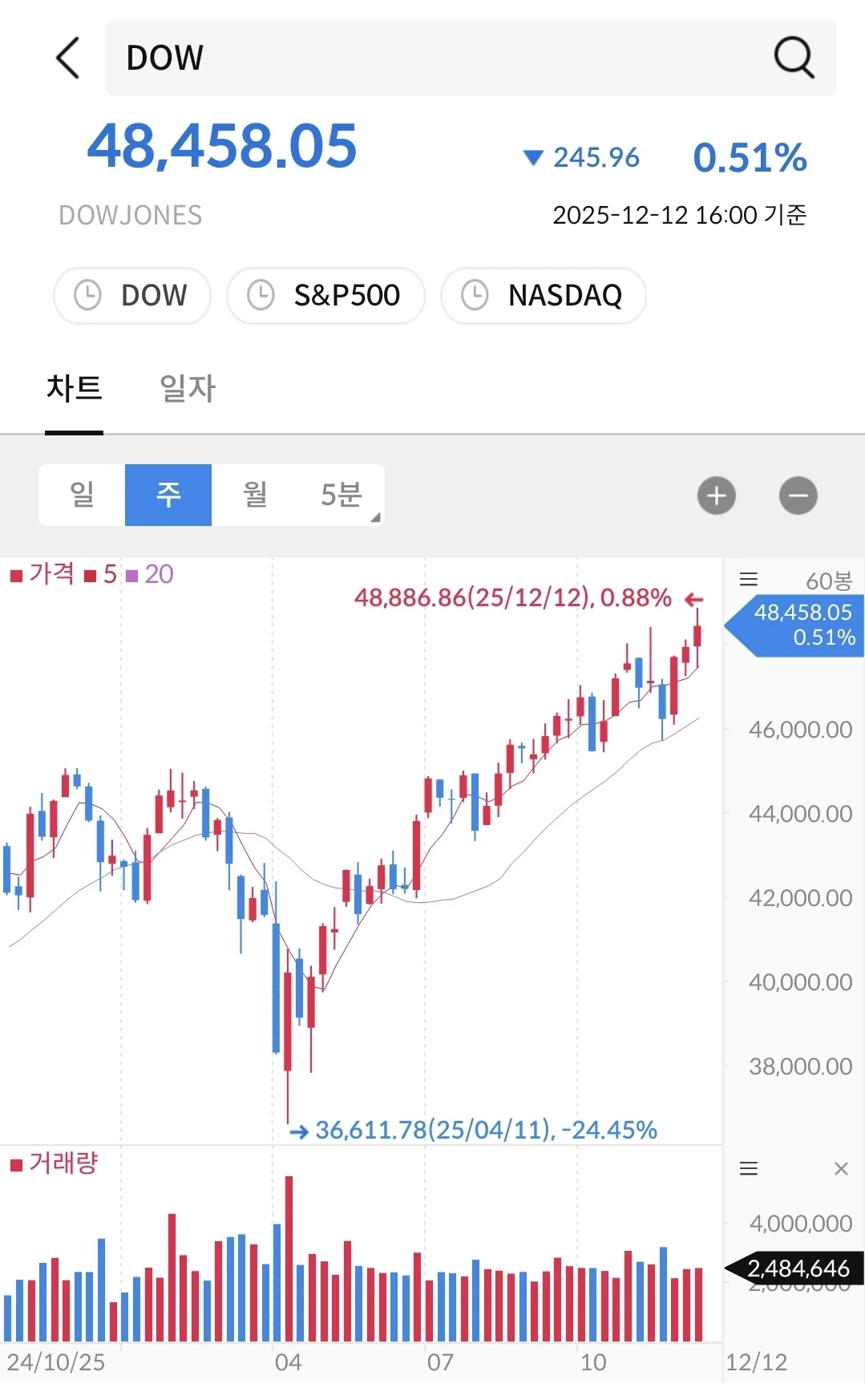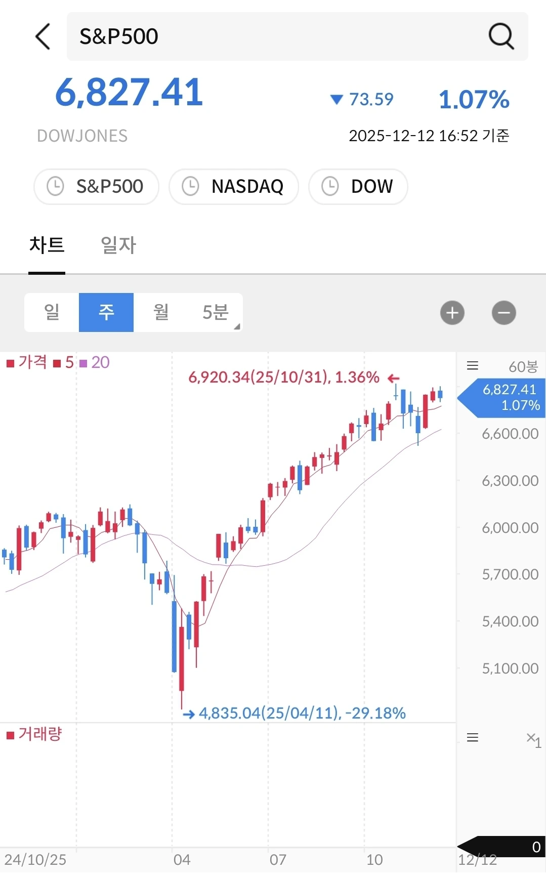 나스닥과 비슷한 패턴이다. 우상향이고 등락을 반복 중이다.