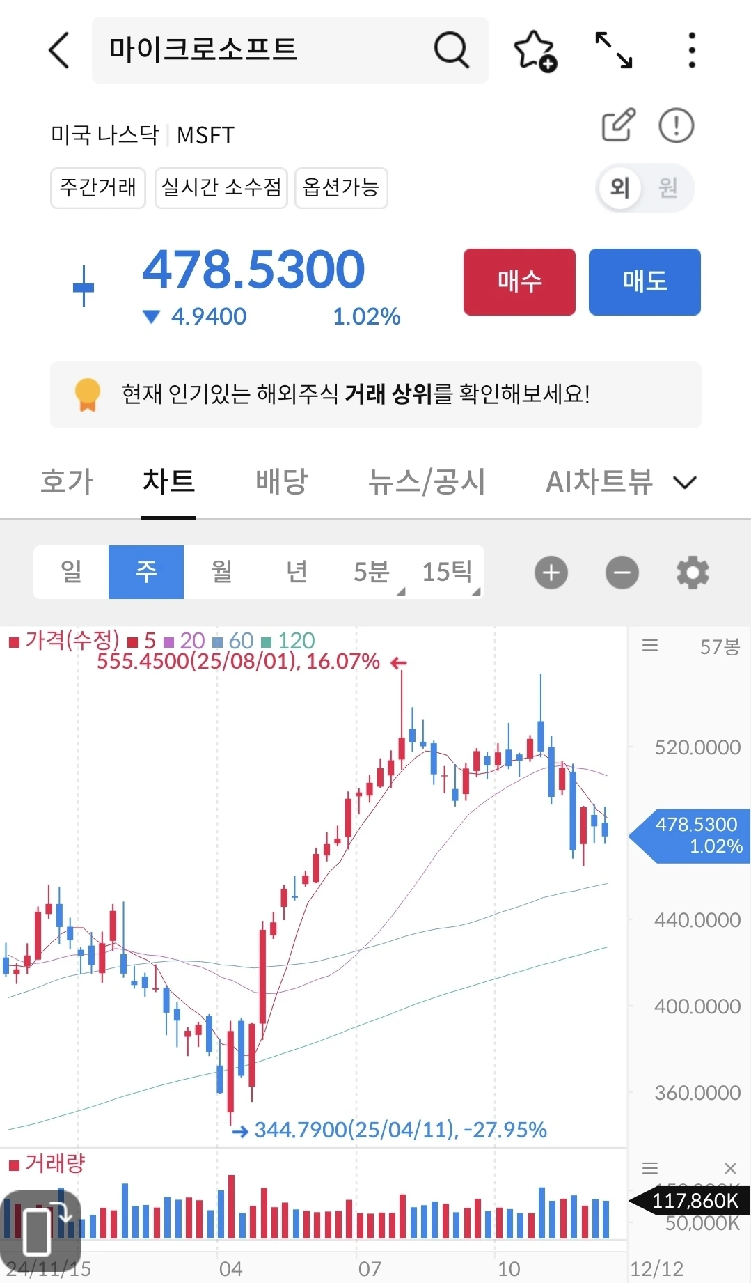 고점을 찍고 하락 중이다. 내 생각과는 다른 방향으로 움직이고 있다. 인공지능 테마주의 영향을 많이 받고 있다. 좀 더 공부하고 고민해 보자
