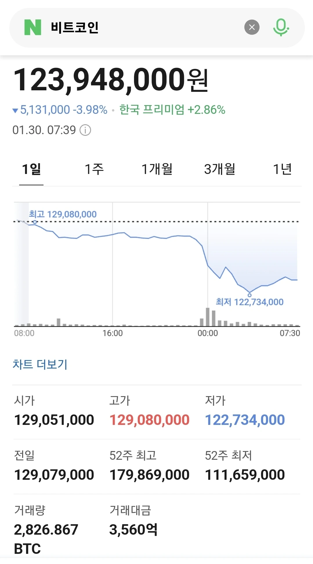 미증시 급락 여파에 1억2300만원대 후퇴