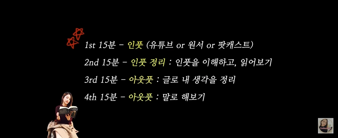 영어에 고수인 듯하신데, 매일 한시간씩 아래의 방법으로 영어 공부를 하고 계신다고 한다. 영어를 잘하는 분도 현상 유지를 위해서, 하루에 한 시간을 할애하여 공부하시는데, 나는 그 이상 해도 현상 유지가 어려울 듯 하나, 일단 하루 15분이라도 시작해 볼려고 한다.