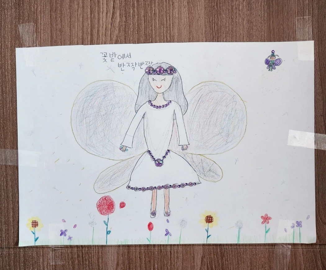엄마가 꽃의 요정이었다고 해서 머리에 화관도 그리고 손에 꽃잎도 들고 있어. 꽃을 만드는 중이라고 생각했거든.