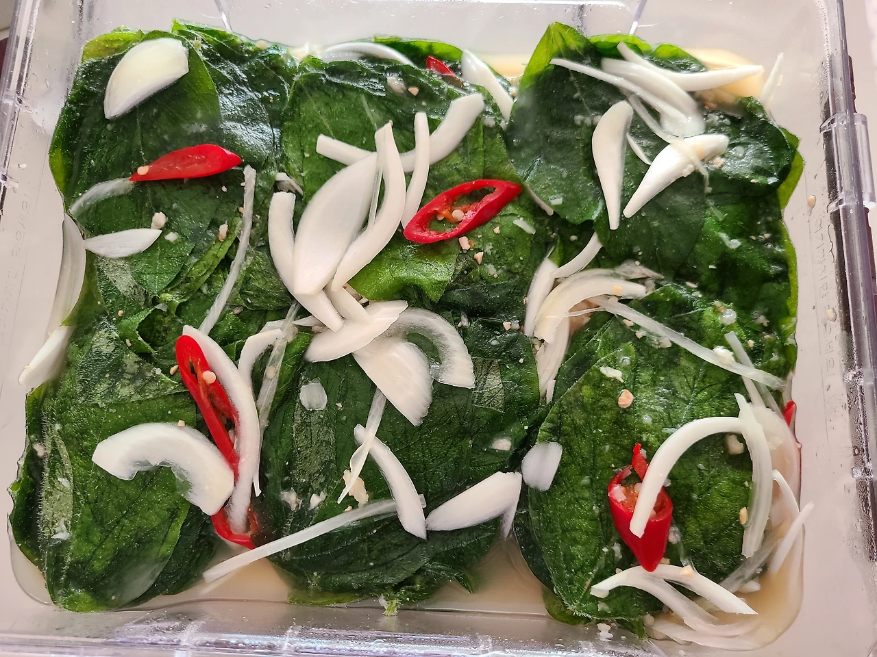찾아보니 콩잎을 소금물에 절이기도 하던데 내가 받은 콩잎은 어린잎이라 보들보들 부드러워서 굳이 절이지 않았다. 정리해 둔 콩잎은 두 세 뭉치정도 남겨두고 김치통에 가지런히 깔았다. 그리고 양파와 홍고추를 대충 썰어 콩잎 위에 덮었다. 커다란 양푼이에 생수를 담고 미리 끓여둔 풀을 가져와 넣었다. 떡이 된 줄 알았는데 물에 넣으니 금방 묽게 풀어졌다. 냉동실에 얼려둔 다진 마늘과 생강도 톡 떼어다 넣어준다.