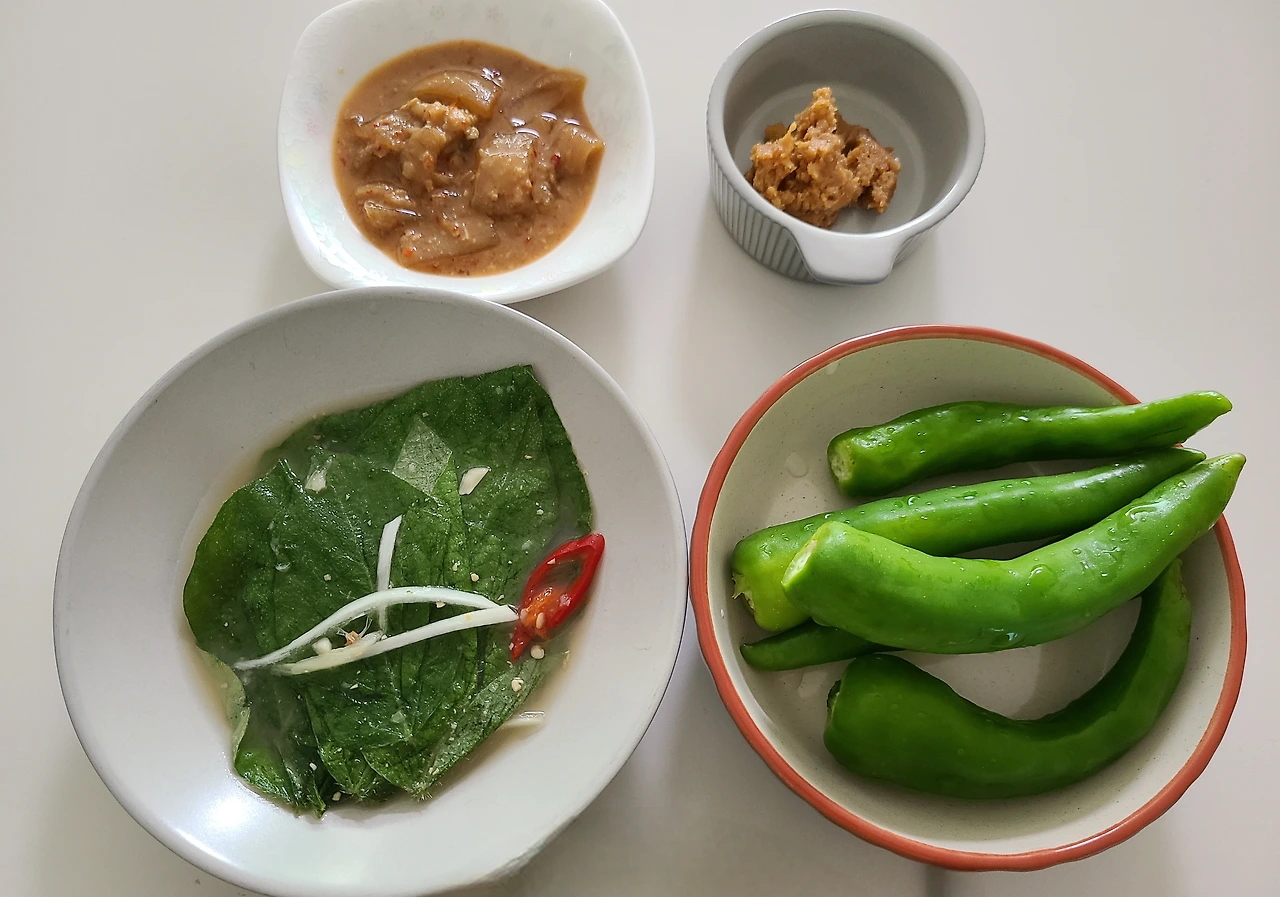 다음 날 점심, 아직 콩잎이 삭기도 전인데 참지 못하고 물김치를 꺼냈다. 싱거우면 강된장을 푹 퍼서 넣으면 될 일이었다. 어머님이 보내주신 아삭한 고추도 몇 개 꺼내서 단출한 밥상을 차렸다. 강된장을 퍼서 밥 위에 올린 뒤 콩잎으로 감싸 입에 넣었다. 아직 콩잎에 맛이 들지 않았지만 바로 국물도 한 숟가락 떠 넣으면 비슷한 맛이 났다.