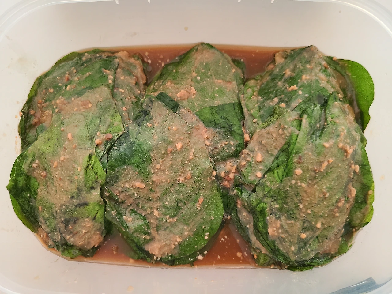 할머니의 묽은 된장을 퍼담고 올리고당은 두어 바퀴 돌려 넣고 섞었다. 간장을 넣을까 하다가 그만하기로 했다. 남은 콩잎에 켜켜이 된장양념을 묻히고 작은 통에 담아 마무리했다.