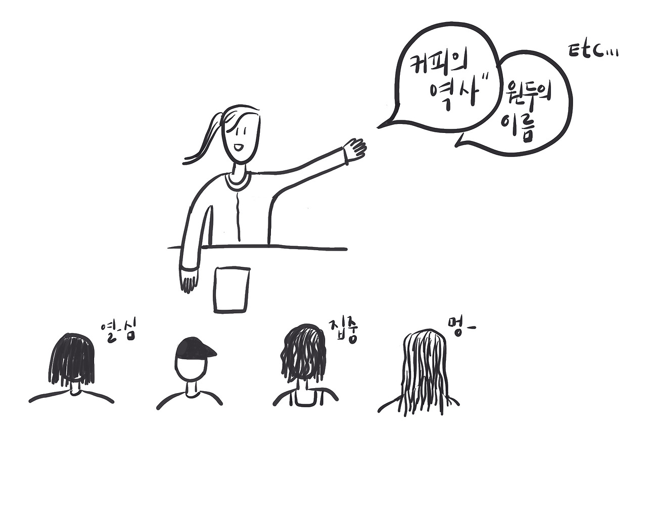 커피의 역사, 원두 재배 방식, 종류, 이름, 맛과 향까지 장장 3시간의 수업을 들었다. 왠지 교실에서 커피 향이 진동을 하는 기분이었다. 시간이 갈수록 처음과 같은 집중력을 유지하기 힘들었지만 뭐든 놓치기 싫어서 노트에 그림도 그리고 메모를 했다. 원래 첫날이 뭐든 파이팅이 되는 날 아닌가.