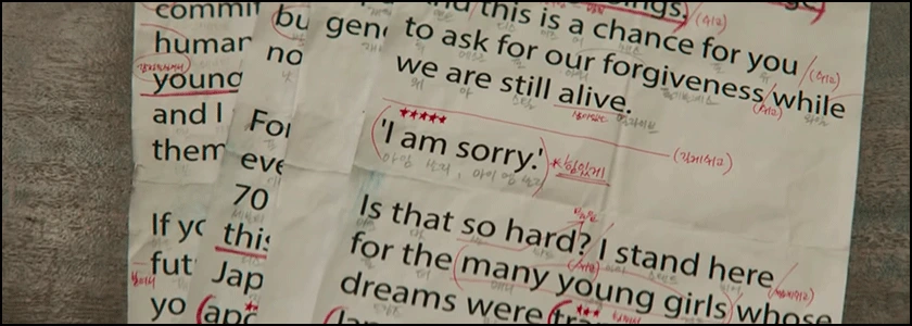 <아이 캔 스피크>는 위안부 피해자 이야기를 담은 영화다. 주인공 나옥분 할머니가 공무원 민재에게 영어를 배우는 이유는 위안부 피해 사실을 국제 사회에 알리기 위해서다. 실제 2007년 일본군 위안부 사죄 결의안이 가결된 상황이 영화에 반영됐다. 나옥분 할머니는 알츠하이머에 걸린 친구 정심을 대신해 연설을 한다. “i’m sorry. is that so hard?”라는 대사 한 마디가 저릿하게 남았다. 할머니의 어떤 시간은 누군가에게 용서를 구할 기회를 주기 위해서 존재했을 것이다.