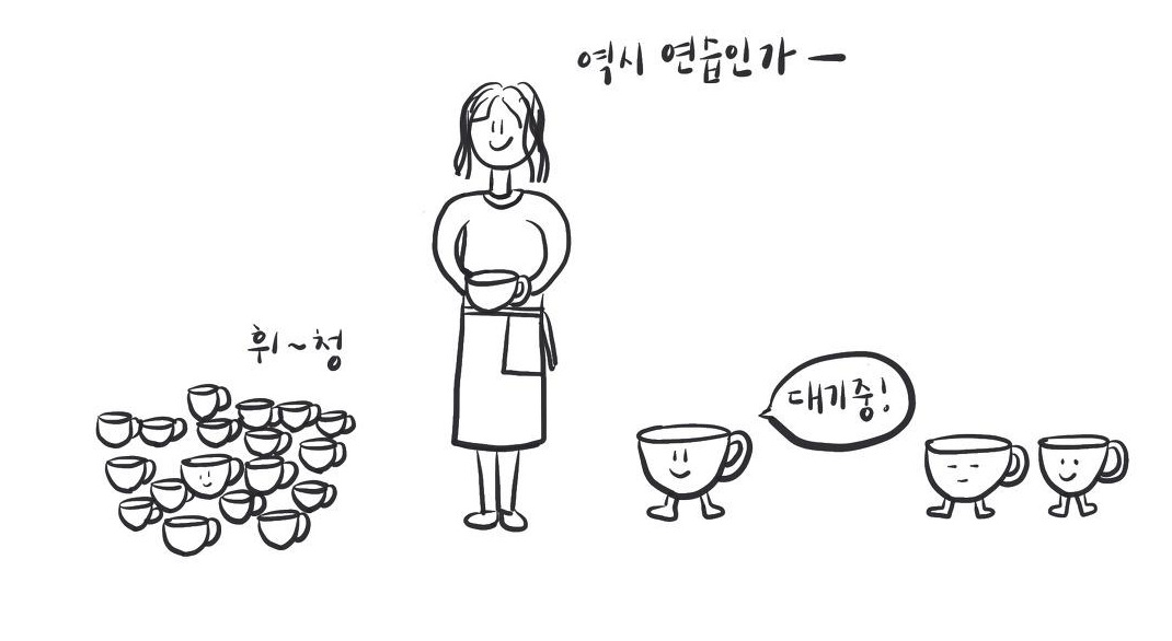 에스프레소를 잘 뽑는다는 건 쉽지 않았다. 정량도 중요하지만 만들 때마다 맛이 달랐다. 감을 익히려고 분쇄한 원두 무게를 재고, 누르는 강도를 조절하면서 탬핑을 한 후 커피가 뽑히는 시간을 쟀다. 계속 연습하면서 사람들이 뽑은 커피도 맛보았다.