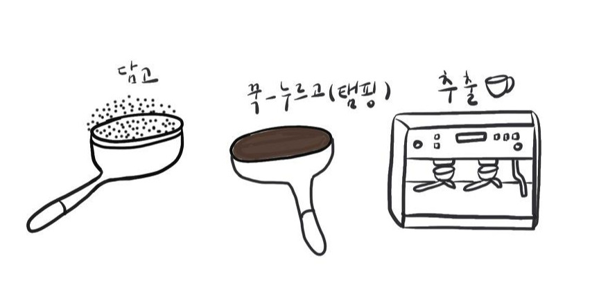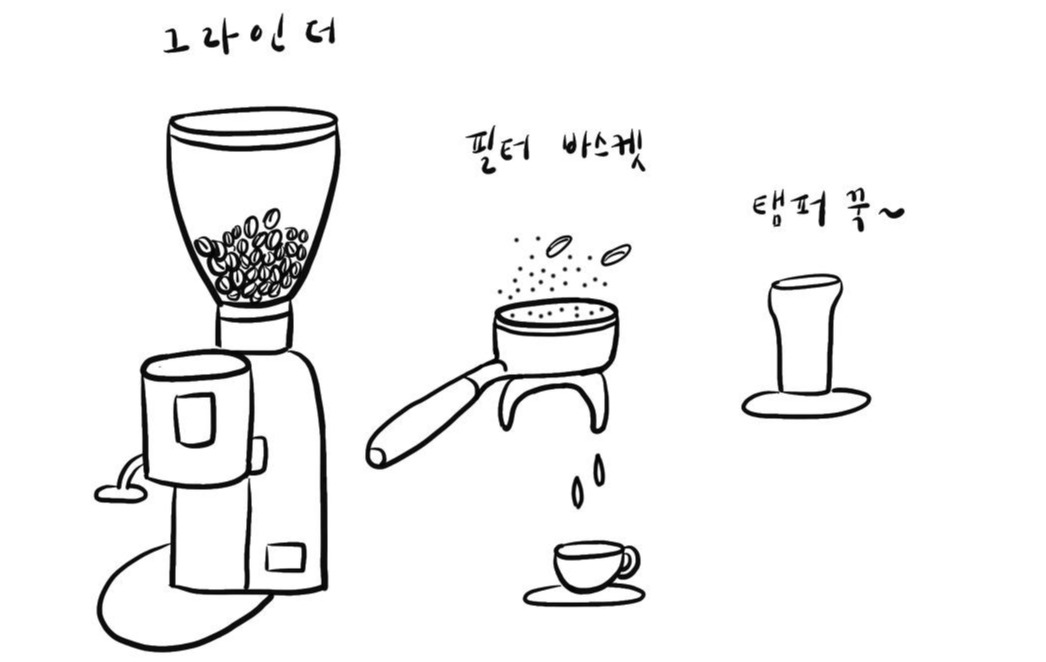 우선 그라인더에서 원두를 분쇄하고 기계에 장착할 포타 필터에 템퍼로 원두를 담아 꾹 눌러주는 탬핑을 한다. 탬핑을 하는 건 기계에 장착하고 추출을 할 때 원두에 물이 고르게 접촉할 수 있게 하기 위함이다. 원두의 양과 탬핑의 정도에 따라 추출 시간도 다르고 맛도 다르다.