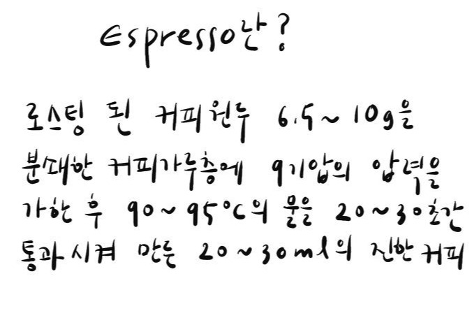첫 실습 시간에 에스프레소를 배웠다. 마끼아또 카페모카 등 첨가물을 넣은 베리에이션 음료의 기본 역할을 하는 에스프레소! 우선 뜻부터 보고 가실게요.