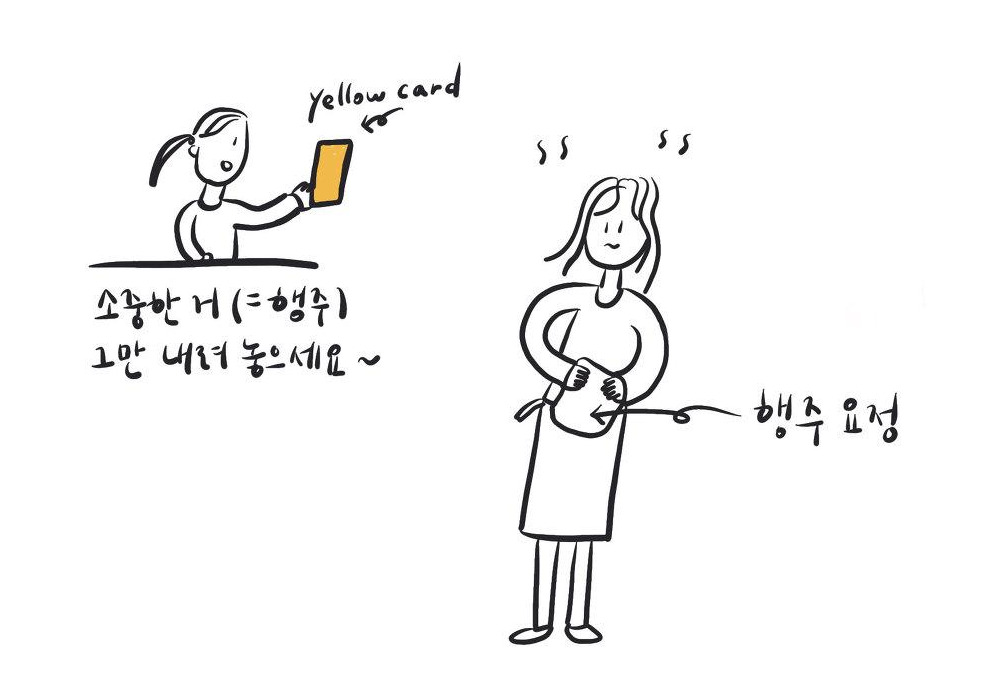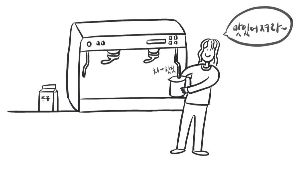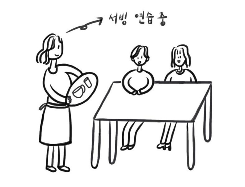 "손님~ 주문하신 카푸치노 두 잔 나왔습니다." 서빙 연습은 어색하고 재미있었다. 왠지 20대 초반 매일 알바를 했던 시절로 돌아간 기분이었달까. 어떤 분은 손을 덜덜 떨기도 했다. 서빙하는 법도 이론으로 배웠는데 그림일기를 쓰는 지금 또 까먹었다. 이것도 결국 몸으로 익혀야 하는 감각이다.