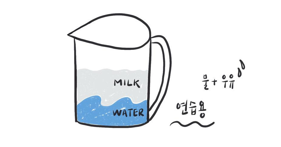 스티밍을 처음 해보는 만큼 낭비되는 우유 양이 많을 테니 연습 단계에서는 물을 섞어서 했다. 나 정말 잘할 수 있을 거 같아!라고 하는 느낌이 올 때만 우유를 100% 넣고 하기로 했다. 연습에서 잘하면 실제로 우유만 넣고 스티밍을 했을 때 더 풍부하고 고운 결과물을 얻을 수 있다고 하니 일단 맛과 상관없이 연습에 돌입했다.