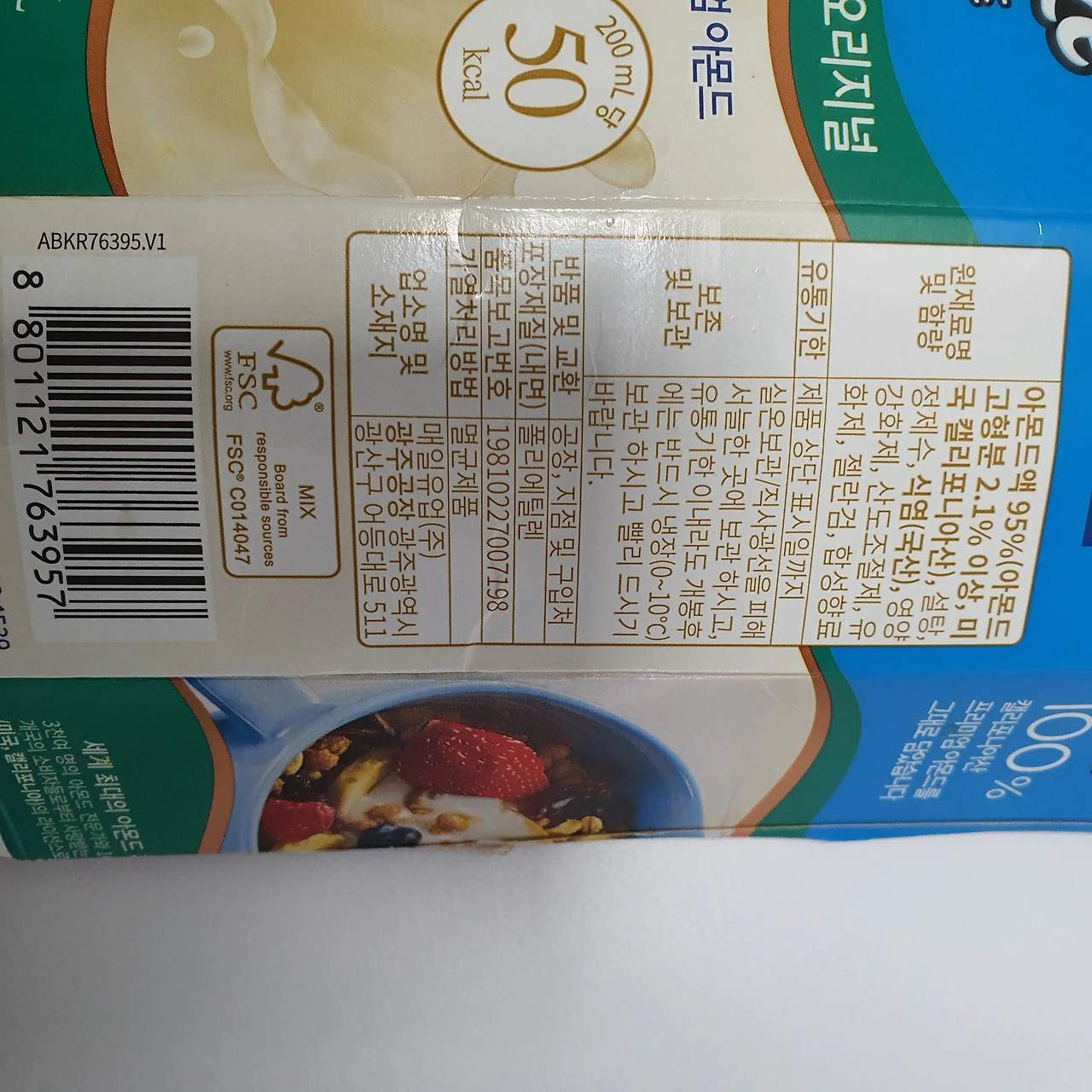 아몬드 브리즈는 멸균팩이라고 해서 오래 보관할 수 있도록 빛이 투과하지 못하도록 안쪽에 은박 재질이 덧대어져 있어요