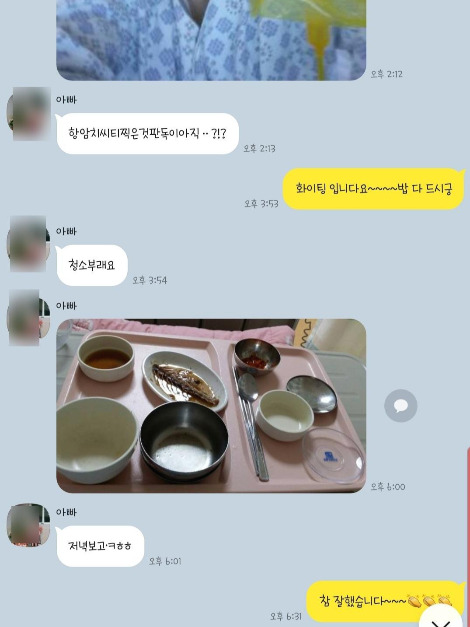 항상 식사는 꼭 다 하셔야 한다고 잘 먹어야 한다고 하니 병원에서 식사하시고나면 꼭 딸한테 보고하신다 항암주사맞으시는것도 꼭 카톡으로 보내주신다 시작하신다고