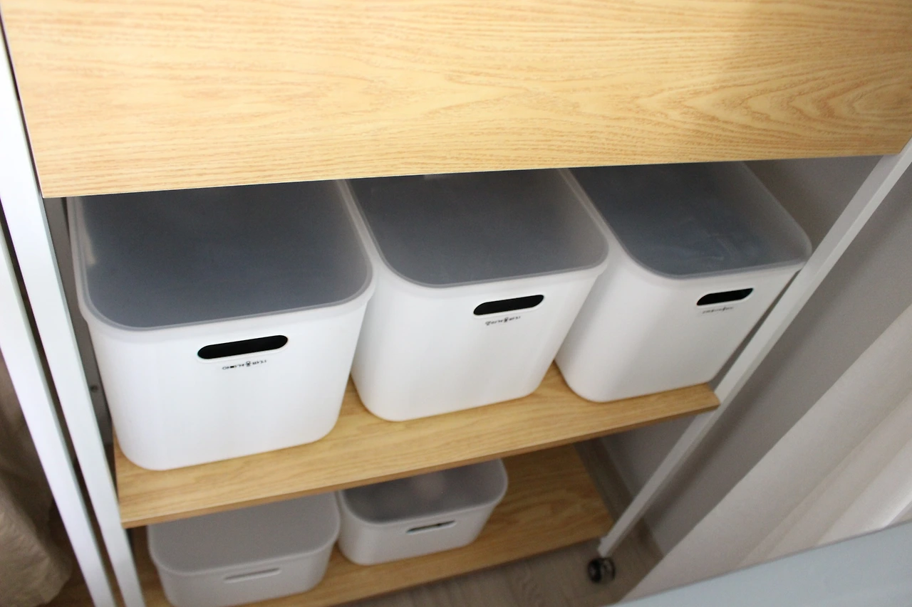 5단 서랍 외에는 서랍이 없어서 플라스틱 보관함을 이용하여 겨울 바지를 보관하고 있다