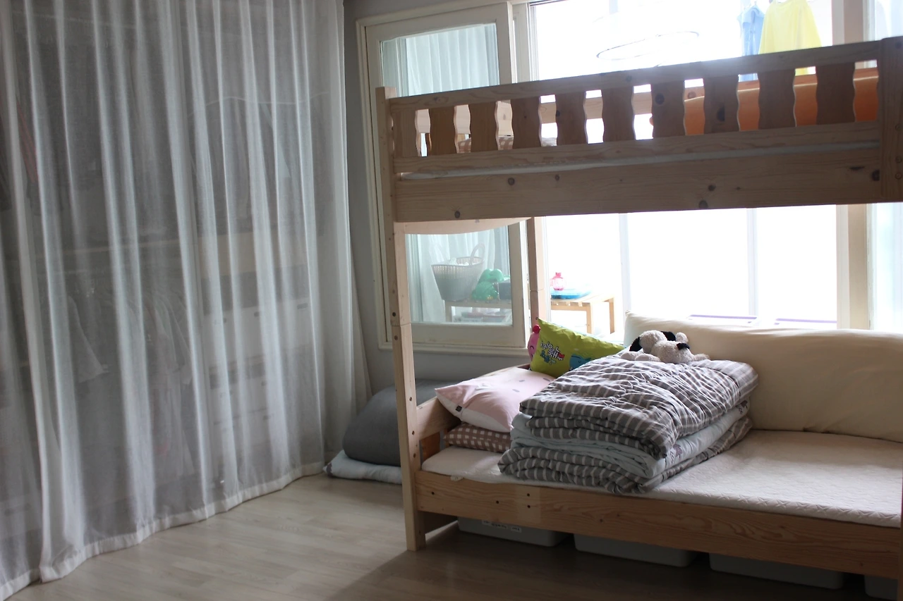 22평으로 이사 간 뒤 가족수가 5인이 되었다. 아이들 옷에 기본적인 가구들만 해도 방마다 가득 차는데 어떻게 2층 침대를 사줄 수가 있었겠냐 말이다. 그렇다고 거실엔 2층 침대를 두고 살 수는 없었고