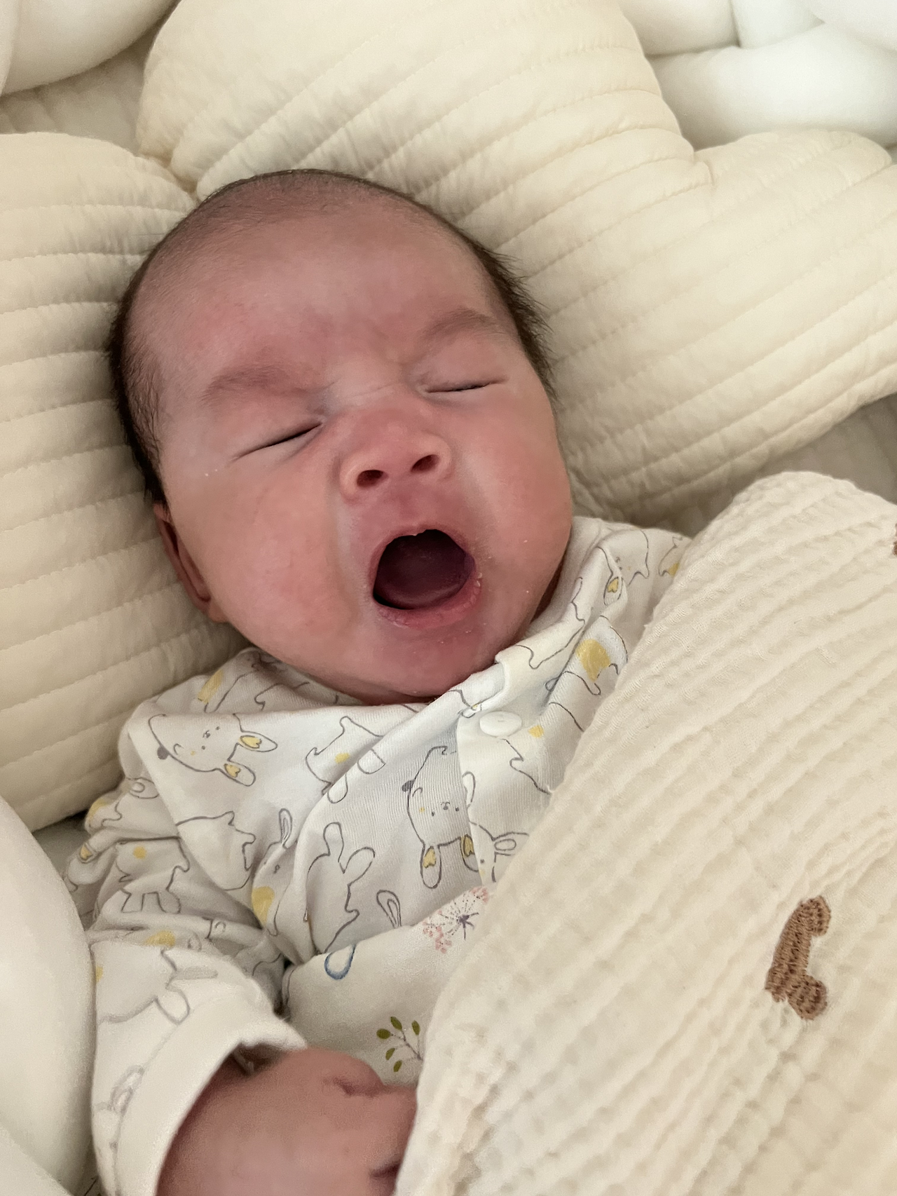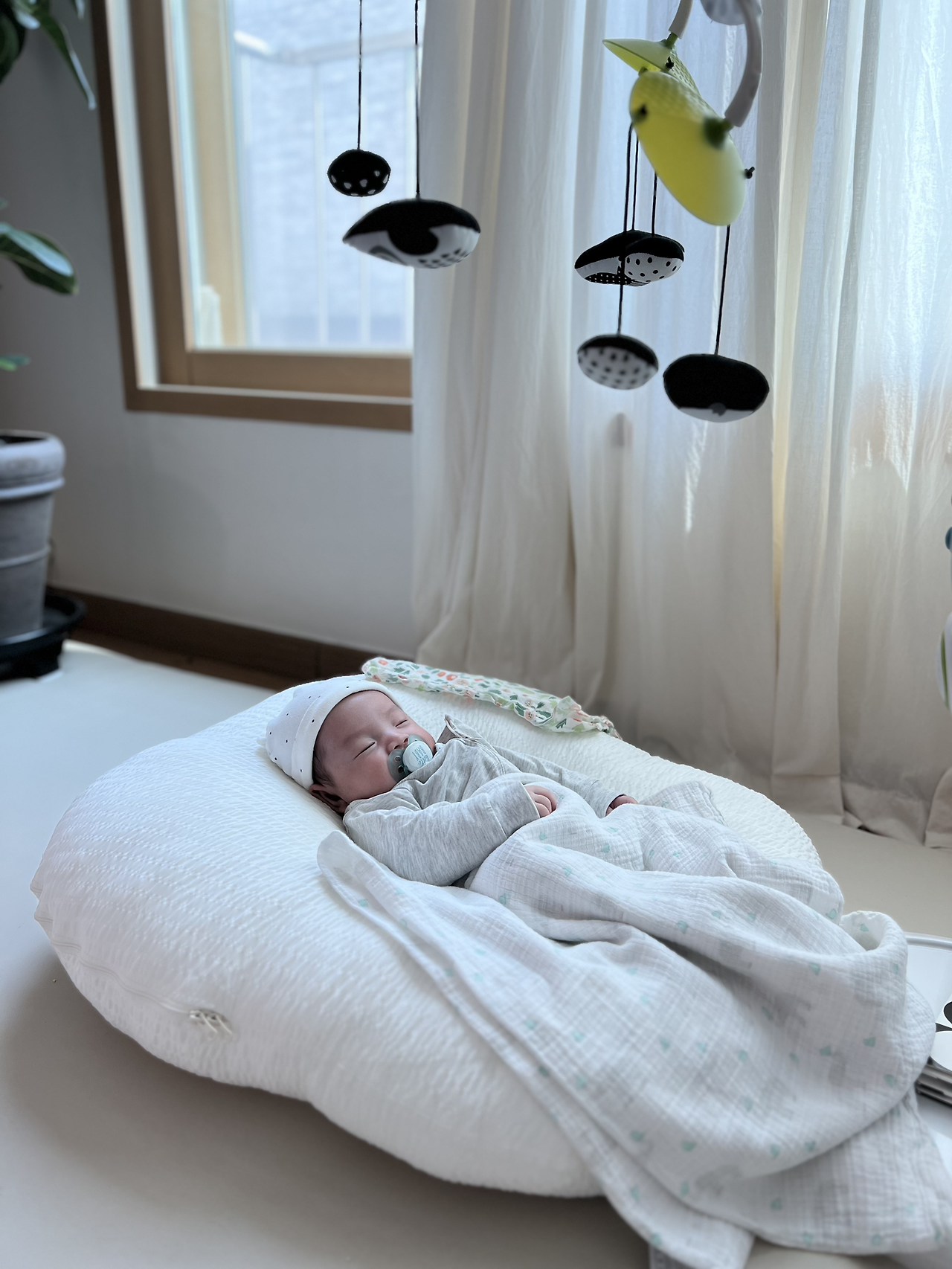 안고 있으면 누우려고 머리와 다리에 힘을 준다. 자기가 좋아하는 자세인가 보다 하고 원하는 대로 안아준다. 이렇게 조그만 아기가 취향이란 게 있다는 게 신기하고 웃기다. 눈 맞춤도 꽤 잘 된다. 한없이 맑은 포도의 눈.