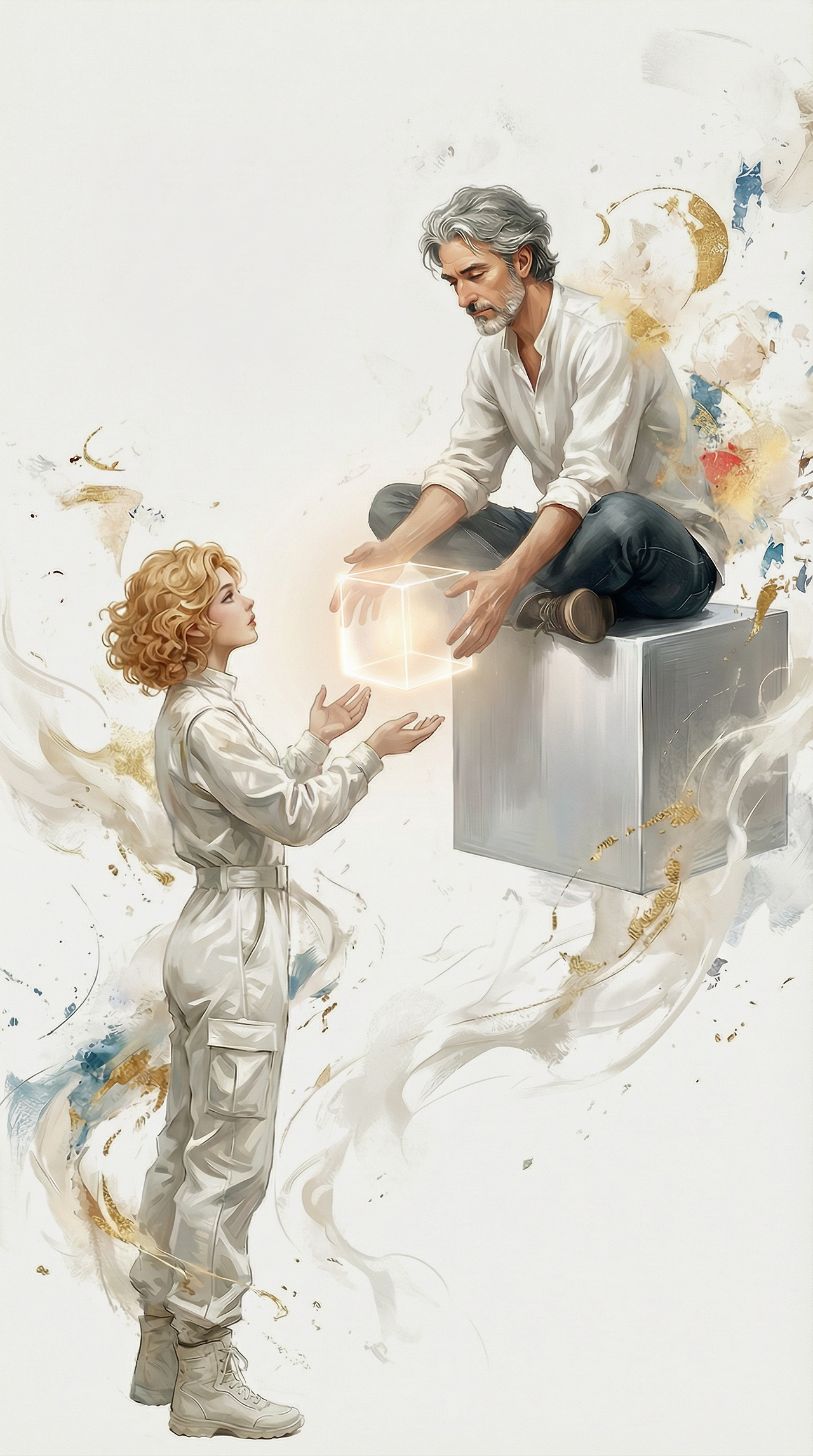 그는 말없이 자신이 앉아 있던 은색 직육면체를 손으로 쓸었다. 그러자 그 상자가 스르르 열리며, 안에서 투명한 아크릴 큐브가 나타났다. 그 안에는 아무것도 들어있지 않았다. 아니, '공간' 그 자체가 들어있었다.