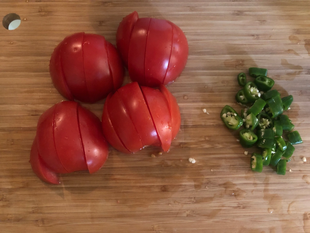 재료는 계란 세 개와 완숙토마토 2개, 소금과 설탕 그리고 매운맛을 좋아하면 고추는 기호껏.