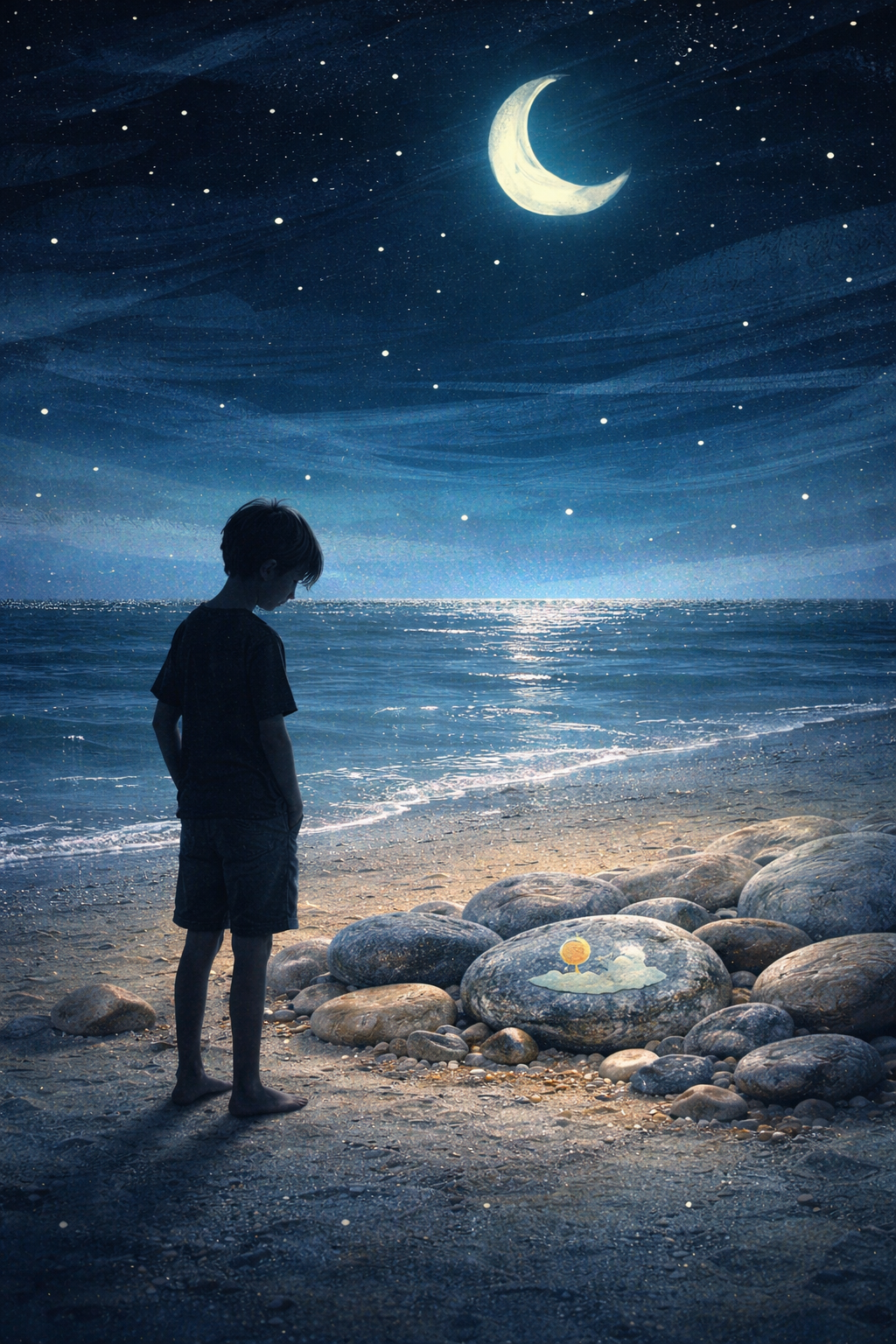 아이는 모래 위에 남겨진 바위를 닮은 돌 앞에서