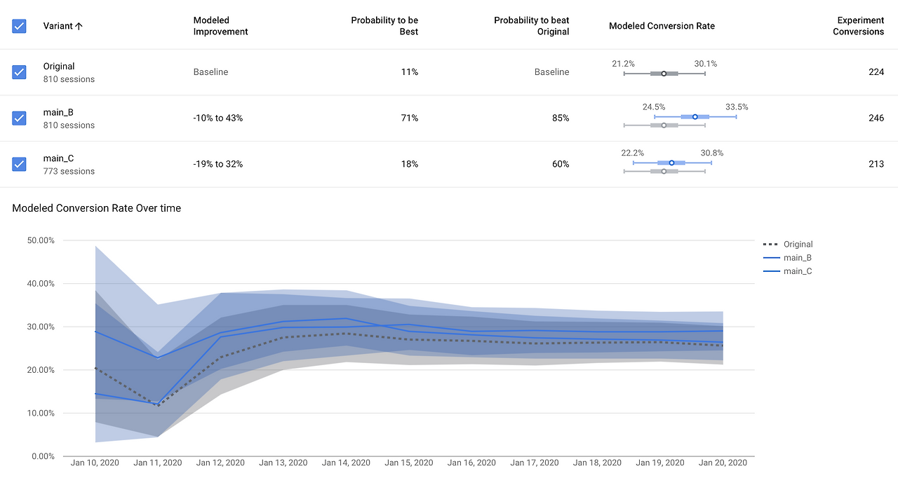 A/B/C 테스트는 구글 최적화 도구(Google Optimize)를 활용해 진행했다. 현재 우리 앱의 홈 화면은 '웹'으로 설계돼 있어서 구글 최적화 도구를 활용할 수 있었다. 구글 최적화 도구를 활용하면 사용자에게 무작위로 A, B, C 중에 하나의 디자인을 보여준다. 각 시안을 본 사용자가 각각 800명쯤 됐을 때 충분한 숫자에게 테스트를 한 것으로 보고, A/B/C 테스트를 마무리했다.