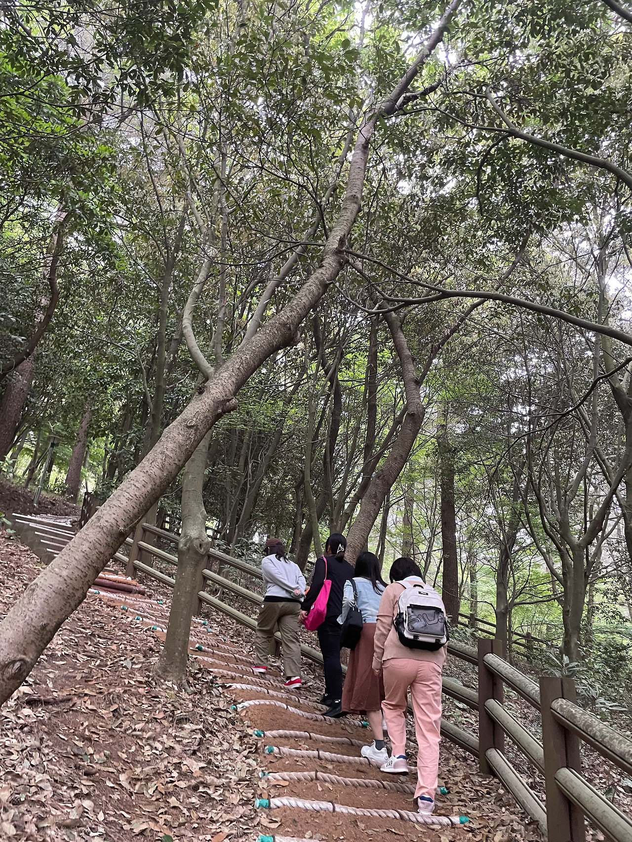 푸르름을 뒤에 두고 앞에 보이는 정자로 향했다. 천장이 있는 형태라 아늑했다. 각자 자리에 앉아 편하게 눈을 감았다. 제주에서 명상지도를 하고 있는 친구 C의 목소리가 조용히 울려 퍼졌다. 명상을 마치고, 대나무숲으로 가고 싶다는 그녀의 말에 우리는 난데없이 언덕을 오르기 시작했다. 10분 정도 오르자 정상이 나왔고 뒷산으로 동네마실을 나온듯한 현지인에게 부탁해 단체사진을 찍었다. 누가봐도 즐거운 관광객들이었다.