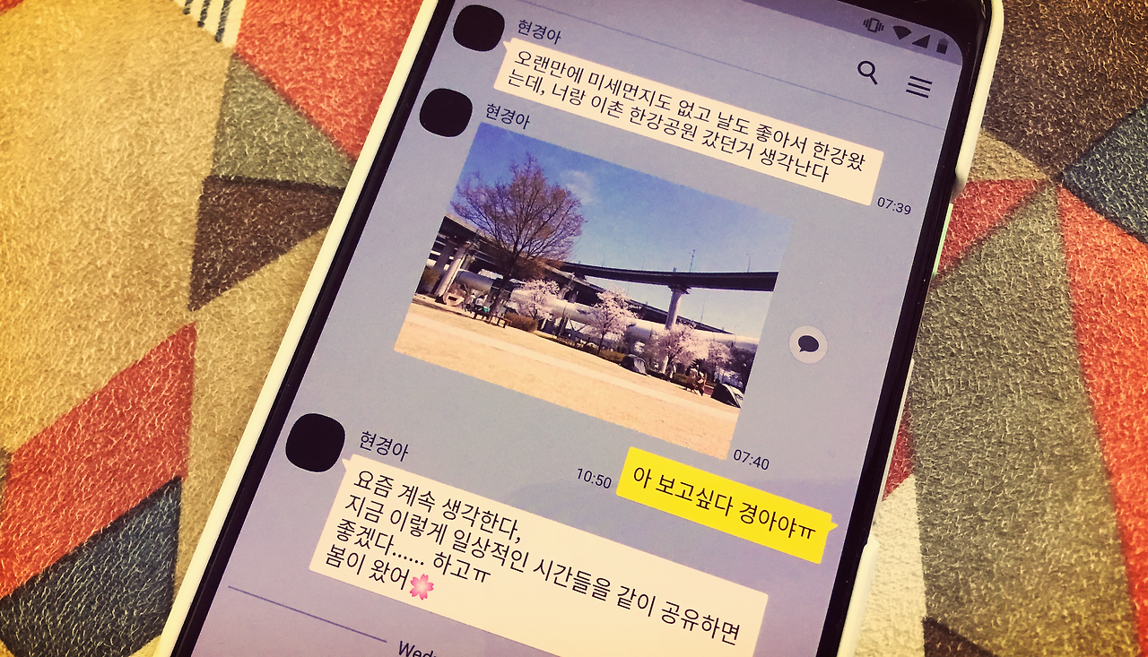 그렇다고 무작정 메신저를 지워버리기에는, 자주 연락하는 가족과 친구들이 있기에 쉽지가 않다. 새로운 계정을 만들어보라는 친구들의 권유도 있었지만, 아직은 완벽히 온라인 이민을 할 마음의 준비가 되지 않은 것 같다. 정말 이 끈을 놓아버리면, 영영 잊힐 테니까. 다시 볼 일 없는 사람들 때문에, 다시 보고 싶은 사람들을 잃을까 봐 겁이 난다. 그리고 무미건조한 와츠앱(Whatsapp)의 깜깜한 채팅창을 바라보다, 카톡의 밝고 귀여운 이모티콘들을 보고 나도 모르게 기분이 좋아지는 것은, 아직까지도 한국의 것들을 그리워하는 내 마음의 한 부분인 것 같아 씁쓸해지기도 한다.