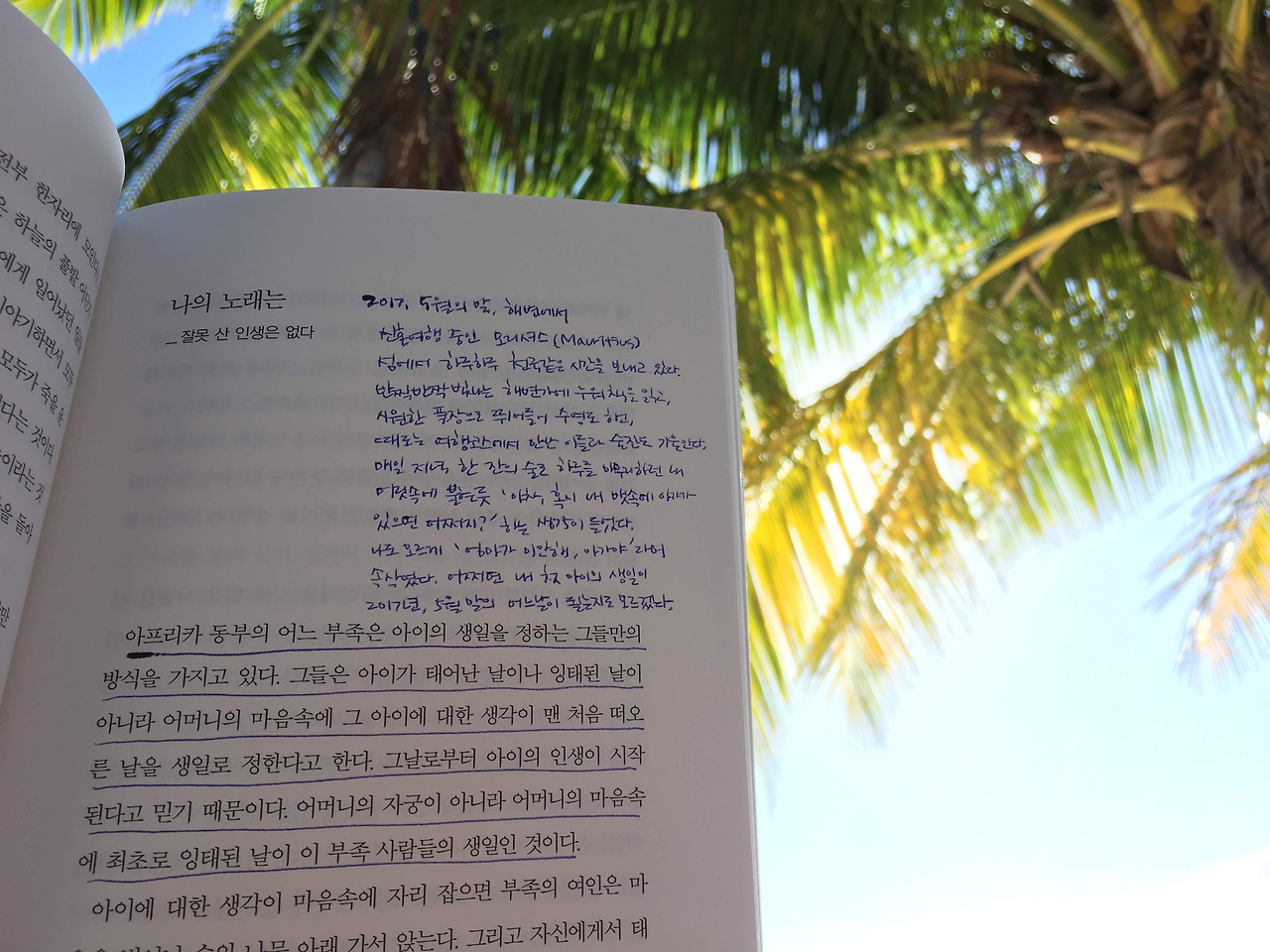 엄마에게 5월은 아주 뜻깊은 달이야. 2016년 아빠와 독일, 그리고 한국에서 두 번의 결혼식을 치른 달이고, 2017년 아빠와 함께 1년 늦은 신혼여행을 떠난 달이기도 하거든. '신혼여행은 무조건 쉬러 가는 거야'라며 하루 종일 여유 부리며 놀 수 있는 곳을 찾다가, 아프리카의 아름다운 섬, 모리셔스로 갔어. 평소에 근검절약이 몸에 뵌 아빠지만, 이번에는 큰맘 먹고 - 인생에 단 한 번 뿐이라는 가정하에 - 아주 좋은 리조트에서 2주라는 시간을 보냈어. 매일 아침 느지막이 일어나 야외 레스토랑에서 브런치를 먹고, 해변에서 수영을 하거나 모래사장에 누워 책을 읽으며 시간을 보냈어. 뭔가 특별한 것이 필요한 날이면 새벽 일찍 일어나 돌고래랑 수영을 하기도 하고, 새로운 사람들과 함께 산행을 가지도 했지. 매일매일이 천국 같은 시간이었어.