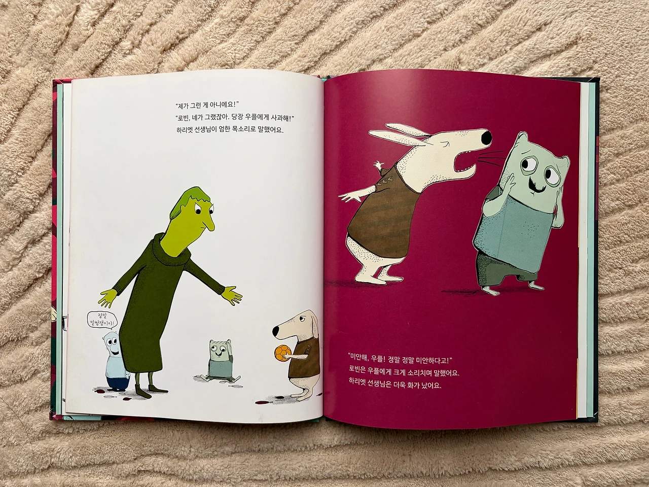 아이들과 함께 동화책을 읽다 보면, '이 책을 왜 좋아할까' 싶은 책들을 만날 때가 있다. 물론 제각기 다 좋은 책들이지만, 이야기와 그림이 어둡거나 슬퍼서 아이들의 흥미를 사기 어려울 것 같은데도 유난히 아이들이 좋아라 하는 책들이다. 『로빈하운드 실수해도 괜찮아!』가 바로 그런 책들 중 하나이다. 이든이가 더듬더듬 말을 시작할 때 즈음 거의 매일 읽어달라 가져오던 이 책은, 주인공 로빈의 하루에 대한 이야기다. 혼자 우유를 따르다 친구인 우플 얼굴에 쏟아버리고, 그네 타는 친구 판타를 밀어주다 그네를 끊어버린 로빈. 거기다 공놀이를 하다 찬 공기 우플에게 날아가 꽂히자, 선생님에게 불려 가 혼이 난다.