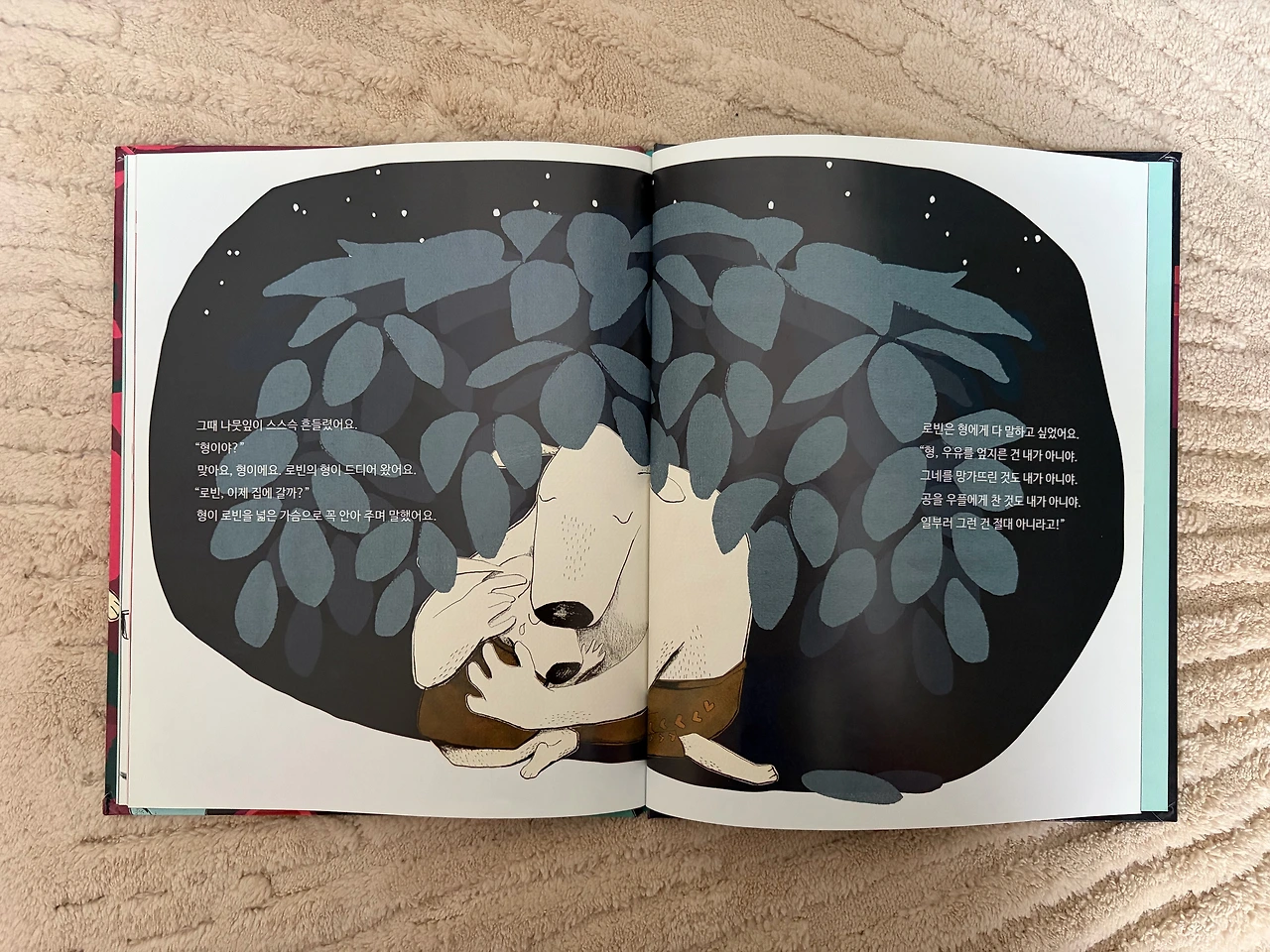 로빈의 형은 '알아'라는 말로 로빈의 마음을 위로해 준다. '네가 그랬잖아!' 하며 로빈이 이미 저질러 버린 일을 혼내기보다, '일부러 그러지 않았잖아'라며 그것이 실수였으니 괜찮다고 말하며 로빈의 편이 되어주는 형. 이든이가 이 책을 좋아하는 이유는 바로 이것 때문이었다.