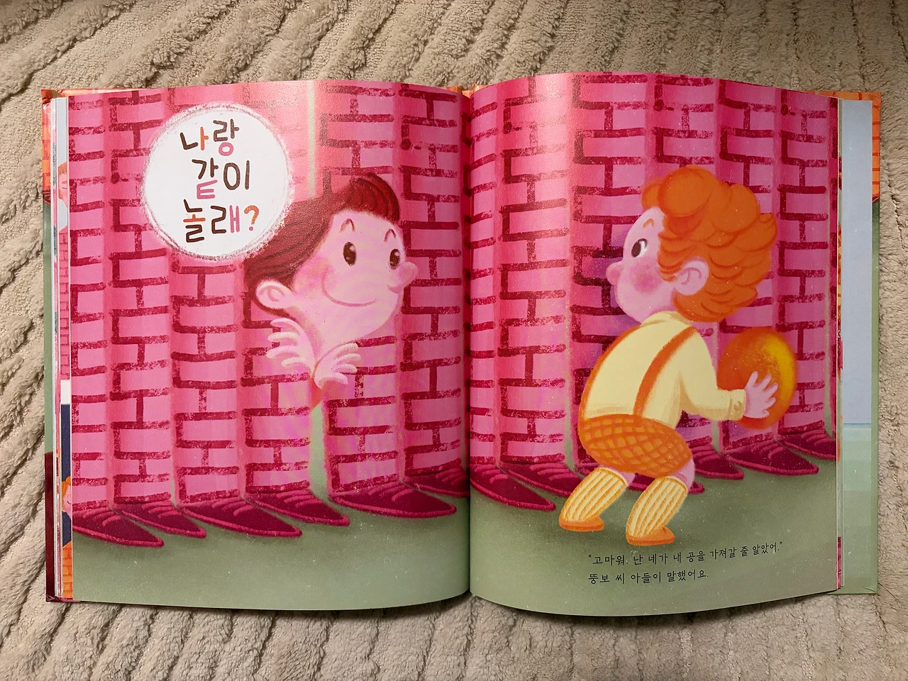 『사이좋게 놀 수 있을까?』는 아주 옛날 하늘과 땅에 주인이 없었던 시절의 이야기로 시작한다. 모든 것이 평화로웠던 그곳에, 사람들이 집을 지으며 하늘에도 땅에도 '자기 것'이 생겨났다. 나란히 집을 가지고 있던 말라깽이 씨와 뚱보 씨도 붙어 있는 땅에 선을 그으며 서로 자기 땅이라 우기며 싸우기 시작했다. 그리고 끝내 하인들에게 무겁고 두꺼운 옷을 입혀 높다란 벽을 만들었다. 그러다 어느 날 공놀이를 하던 뚱보 씨 아이의 공이 말라깽이 씨의 벽 쪽으로 넘어가고 만다. 하인들은 여전히 벽을 만든 채 움직이지 않는데, 그 사이로 말라깽이 씨의 아이가 공을 넘겨주고 둘은 함께 공놀이를 하게 된다. 이 아이들로 인해 높다란 벽처럼 보이던 하인들도 하나 둘 움직이기 시작하고, 그렇게 더 이상 벽은 존재하지 않게 된다. 이 책의 지은이가 대만 사람이어서였는지, 아니면 '이야기의 힘으로 세상의 모든 장벽을 무너뜨릴 수 있기를 바라며 이 글을 썼다'는 지은이의 글을 봐서였는지, 나는 이 책을 읽으며 대만과 한국, 더 나아가 수많은 싸움과 전쟁이 일어나고 있는 우리의 현재를 떠올렸다.