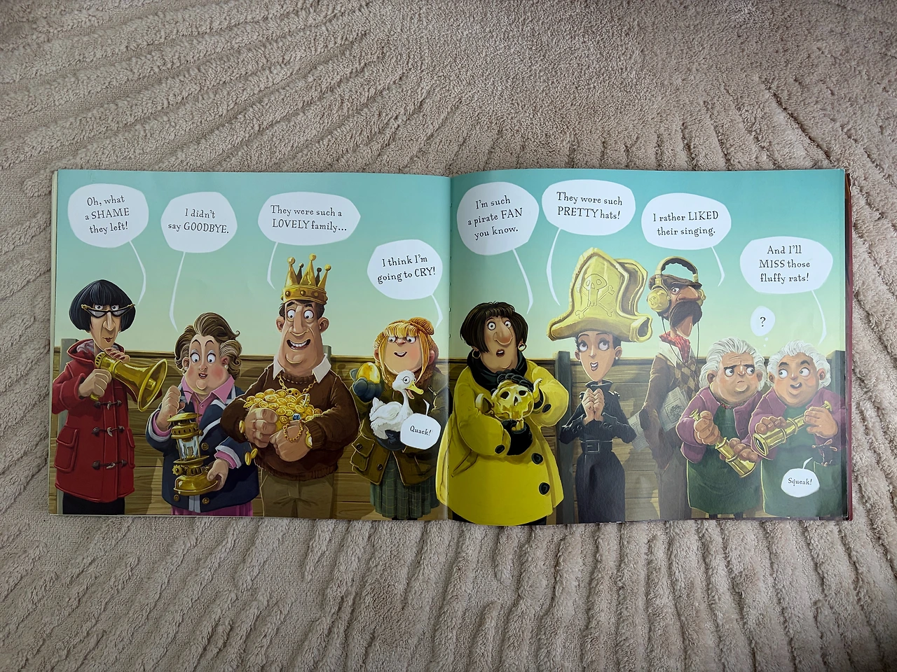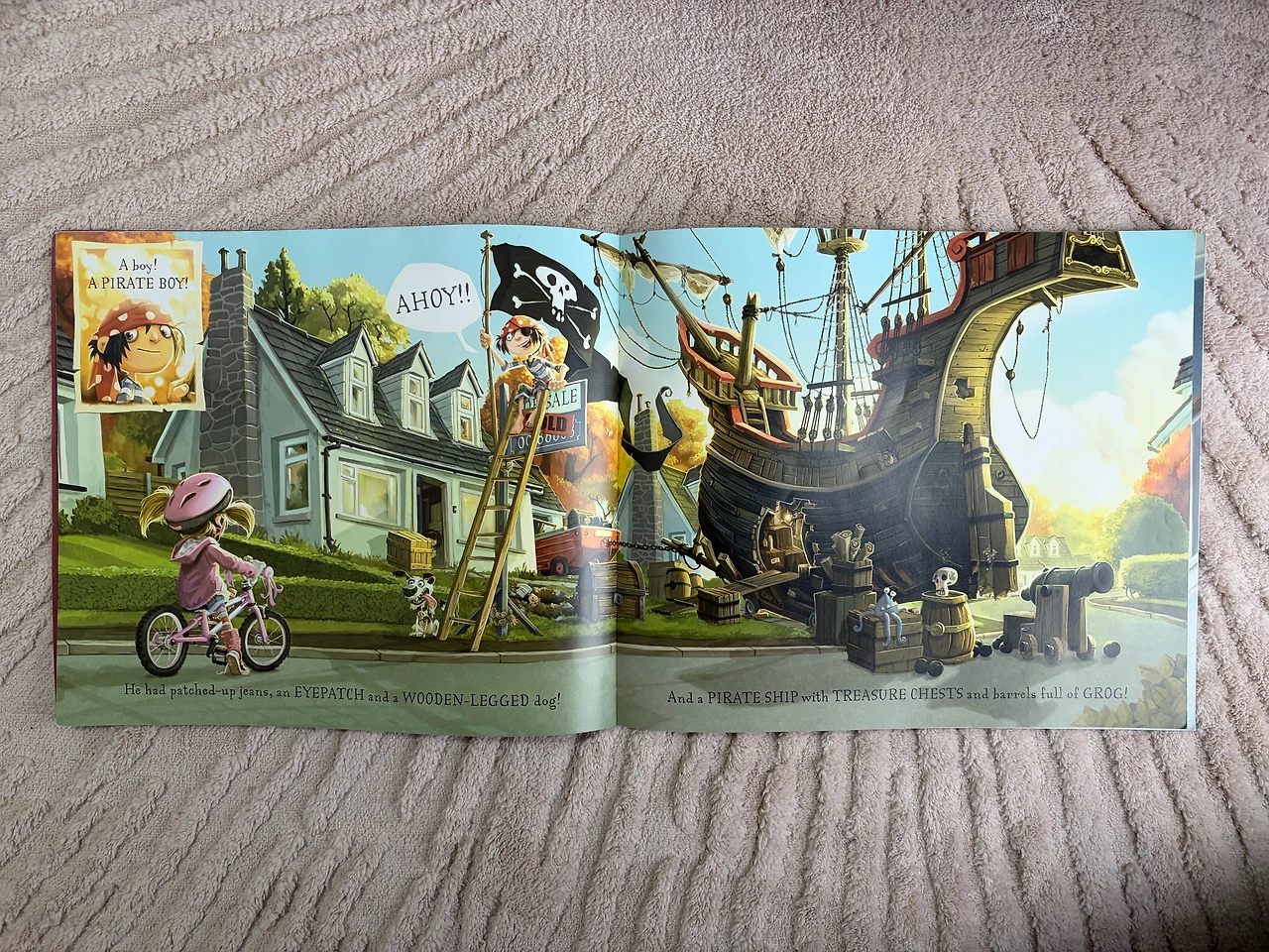 2023년 가을 어느 날, 런던 출장에서 돌아오며 어김없이 들른 기차역 서점에서 이 책을 만났다. 열차 시간이 급해 후다닥 제목과 표지에 있는 그림만 보고, ‘해적이군, 이든이가 좋아하겠네.’ 하며 얼른 계산대로 들고 갔던 기억이 난다. 내 옆집에 해적이 산다는 재미난 상상으로 만들어진 『The Pirates Next Door (이웃집 해적)』은, 꽤나 우울하고 무기력해 보이는 한 바닷가 마을에서 이야기가 시작된다. 재밌을 것 하나 없던 이 동네에 살던 틸다(Tilda)는, 어느 날 허름한 청바지에 안대를 한 해적 소년 짐(Jim)이 옆집으로 이사 오는 것을 발견하게 된다. 커다란 해적선에는 그의 기괴한 가족들이 함께였는데, 신이 난 틸다와는 달리 부모님과 이웃들은 모두 낯선 그들의 모습에 경계심을 표한다. 특히나 이웃 어른들은 고요한 동네의 분위기에 맞지 않는 그들을 이곳에서 쫓아내려 안간힘을 쓴다. 하지만 뼛속까지 해적인 짐과 그의 가족들은, 잠시 이곳에서 다시 떠날 채비를 할 뿐이라며 남들이 뭐라 하건 크게 신경 쓰지 않는다. 해적선을 고치고 다시 길을 떠나는 짐. 그의 가족들은 이웃들에게 작별선물을 두고 떠나는데, 깜짝 놀랄만한 선물들을 받은 이웃들은 언제 그들을 미워했냐는 듯, 환한 미소로 떠난 그들을 그리워한다.