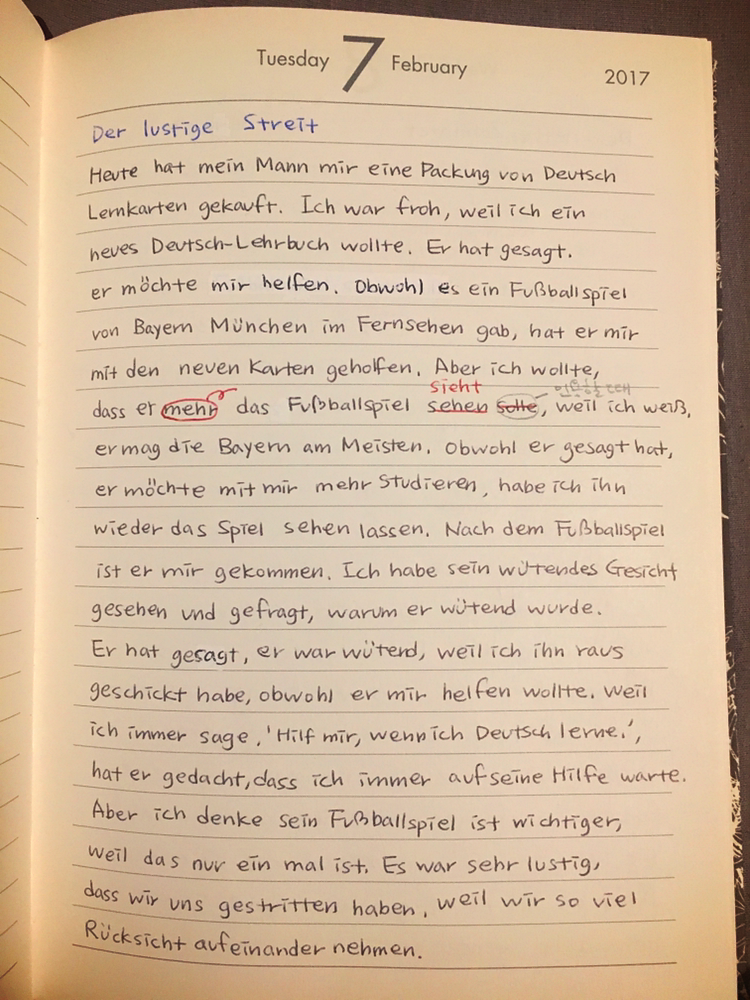 후다닥 저녁식사를 해 치운 후, 마크는 그의 지정석인 거실 소파에 몸을 묻은 채 바이에른 뮌헨의 축구 경기에 열중했고, 나는 침대에 앉아 마크가 새로 사 온 독일어 교재를 열어 보았다. 내가 평소에 갖고 싶었던 카드 형태의 교재에는, 한 카드 당 받아쓰기 하나, 연습문제 세 개가 들어있는 꽤나 알찬 구성의 교재였다. 나는 거실로 달려가 "고마워, 그대가 최고!"를 외치고는 다시 침대로 돌아왔다.