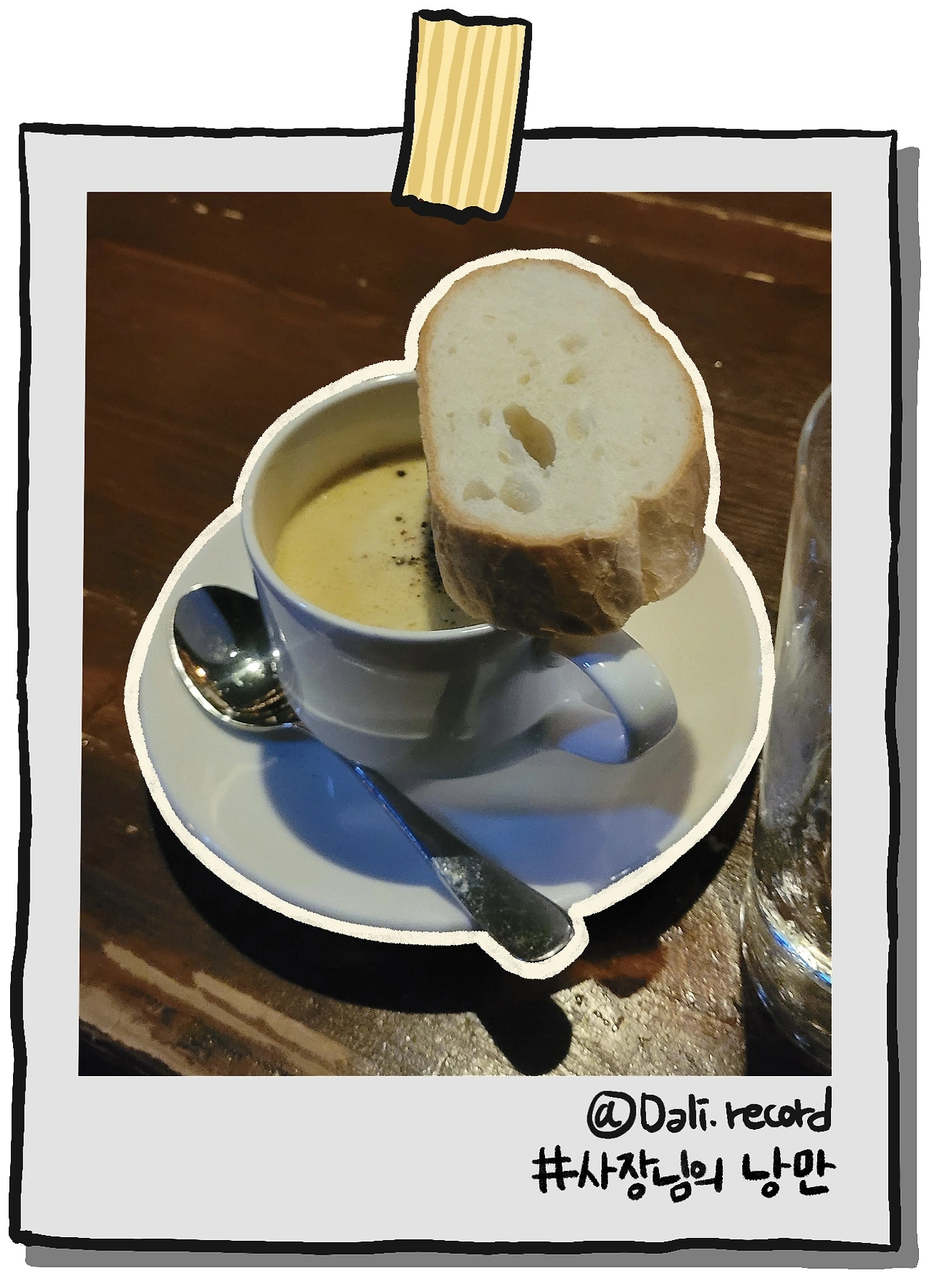 아무튼 스프에 찍어 먹으라며 스프가 담긴 잔 위에 바게트 한 조각을 얹어주셨는데 왜인지 따뜻한 마음이 전해지는 거 같아 혼자 뭉클해졌던 기억이 있다.