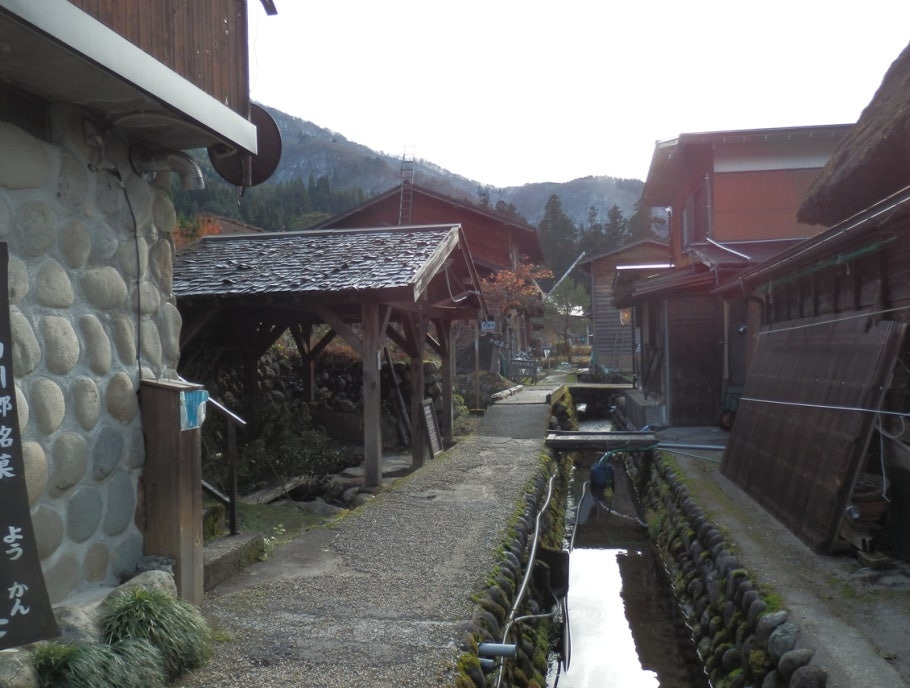 마을 지도에서 볼 수 있는 흰색을 띠는 물줄기는 시라카와고(白川御)라는 이름의 유래가 아닐까 추측해 본다.