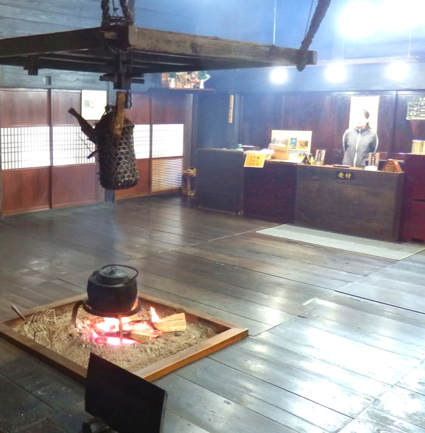아무튼 이곳의 가옥들은 실제로 마을 사람들이 생활하는 곳으로 직접 들어갈 수 있도록 체험관으로 운영하는 곳도 있어서 관람하는 재미가 쏠쏠하다. 우리도 마을을 돌아다니다가 꽤 규모가 있는 가옥이 관람관으로 운영을 하고 있어서 들어가 보기로 했다. 그리고 들어가자마자 눈에 들어온 것은 한가운데 있는 화로의 모습이었다. 사진을 찍은 가옥은 유료관람으로 안 쪽에 카운터가 있었고, 가옥은 2층이라기보다는 복층이라고 하는 게 맞는 듯한 공간으로 올라가 볼 수 있었는데 바닥 쪽에 틈새를 만들어 아래층 화로의 온기가 올라올 수 있도록 만들었다고 한다.