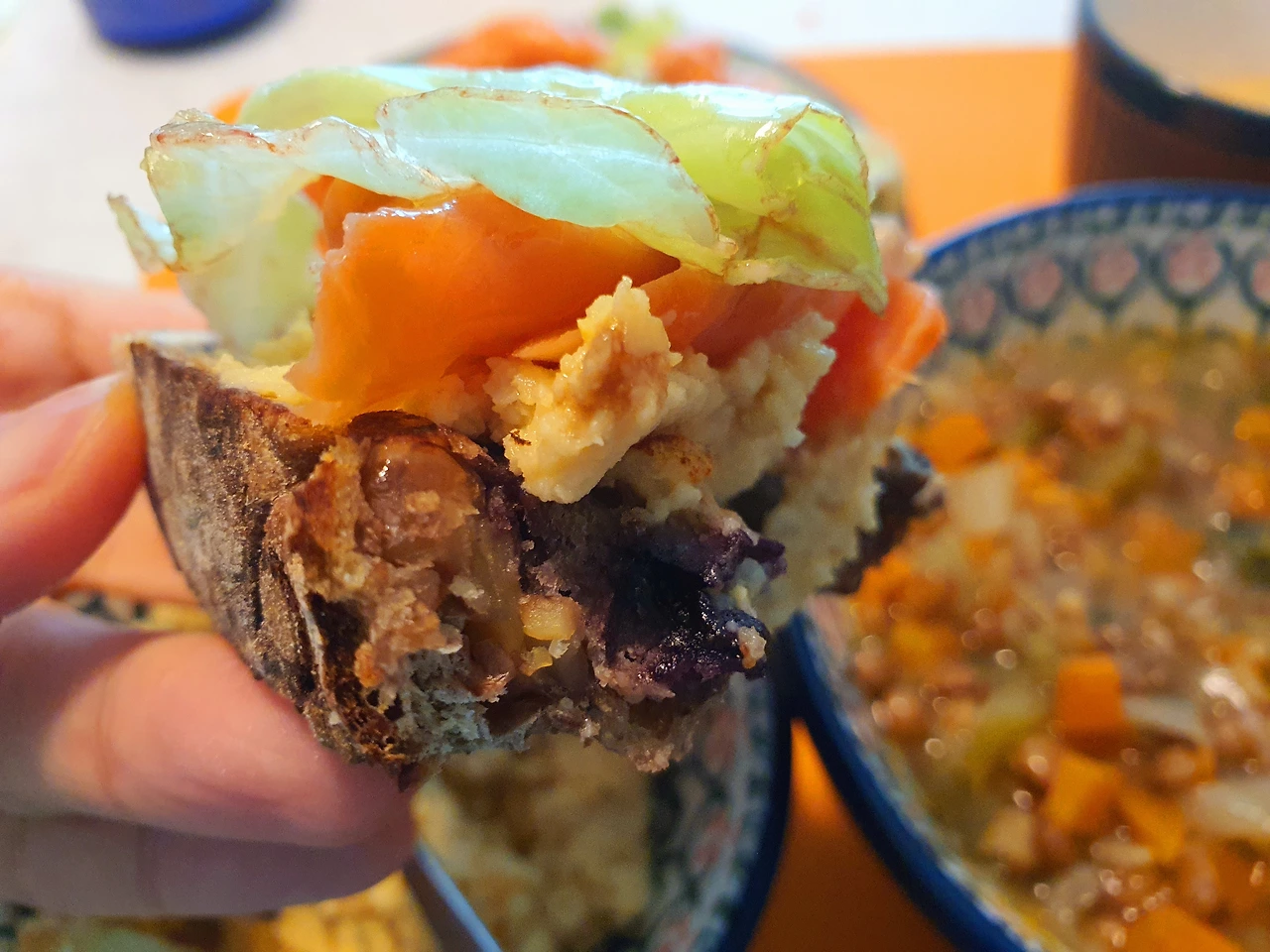맛있는 음식은 살아있다는 감각을 깨워준다. 비가 종종 내리는 날씨 쇠에서 오랜만에 야채스프를 끓이고, 잡곡빵에 연어샐러드에 후무스와 양배추피클로 점심을 차렸다. 엄마, 딸, 며느리, 아내, 강사 등 여러 역할들 속에서 균형을 맞추며 살아가는 나 자신을 위한 밥상이다.