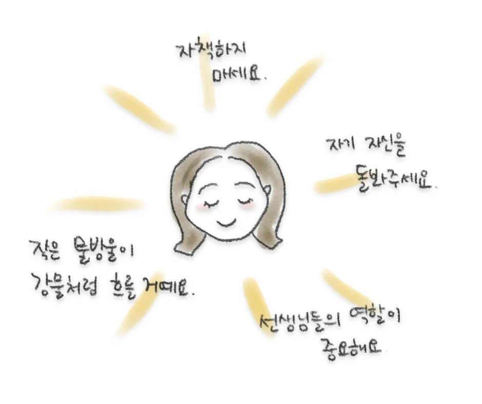 첫 학교에서 함께 근무했던 송우리 선생님도 연수에 참여해주었다. 맨 앞에 앉아 눈을 반짝이며 응원을 해주었다. 연수 후엔 따스하고 아름다운 글과 그림으로 후기를 남겨주었다. 나의 이야기에 공명해주고 이렇게 비춰준 것에 너무나 큰 힘이 났다.