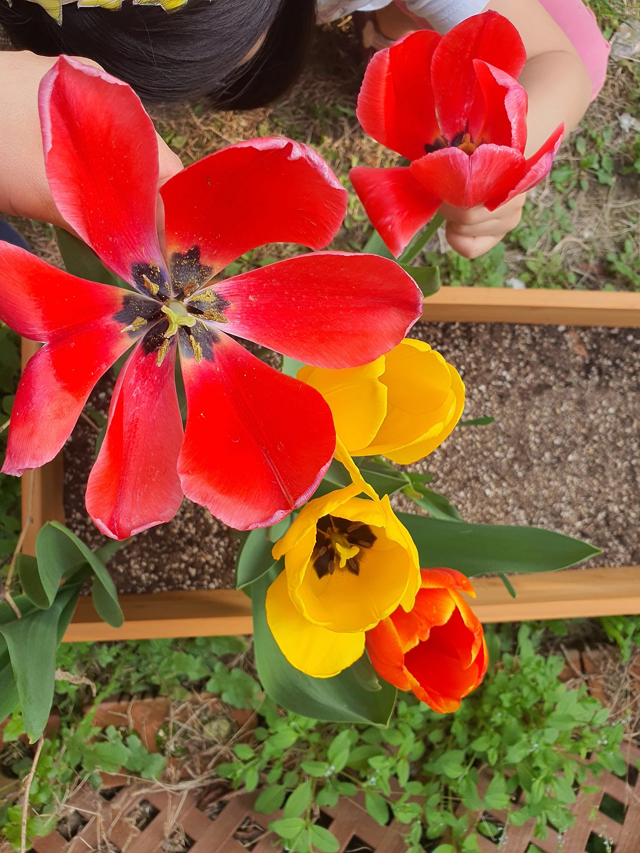 했더니, 뒷마당에 핀 튤립을 주인공으로 세 명이서 번갈아 한 문장씩 이어서 얘기하며 이야기 한 편을 뚝딱 만들었다.