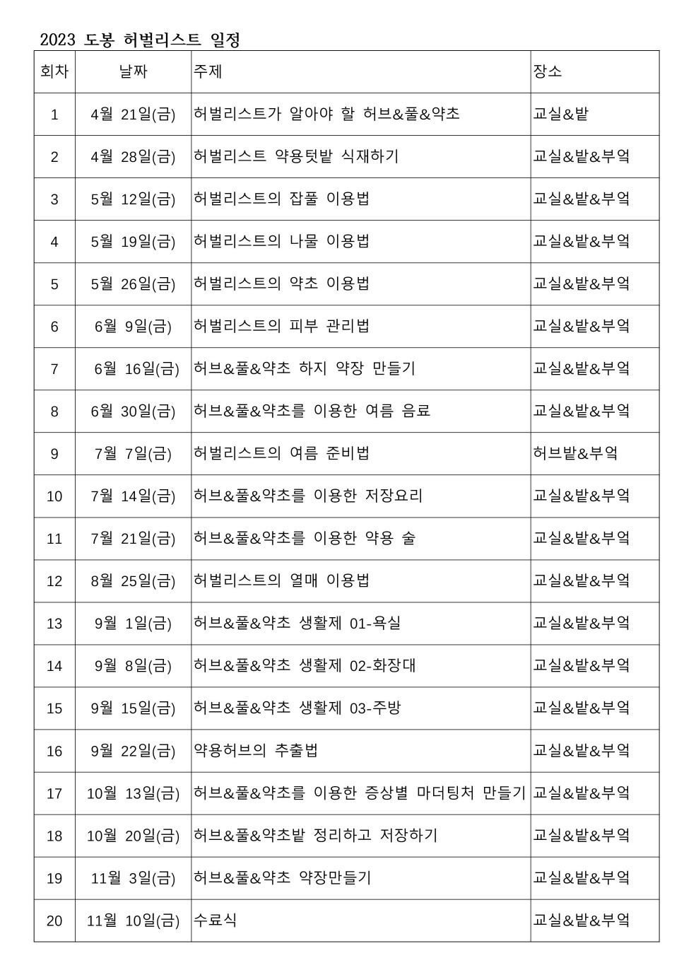 4월부터 11월, 봄부터 가을까지 세 계절동안 어떤 허브들을 만나게 될지, 궁금했다. 수업 신청을 할 때 받은 교육과정을 보니, 장을 담그거나, 약이나 화장품까지... 허브로 할 수 있는 모든 것들을 다 배울 수 있을 것처럼 내용이 알찼다. 무엇보다 도시의 한가운데서 흙을 밟으며 계절의 변화를 느낄 수 있다는 것이 가장 기대가 되었다.