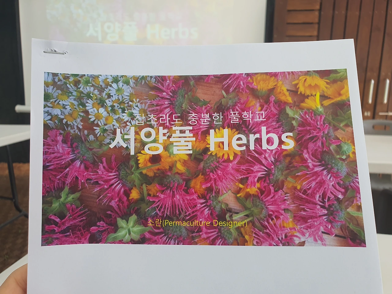 몇 주 뒤 첫 수업 시간이 되어, 설렘으로 두근거리는 마음으로, 도봉구 마을 텃밭 한편의 수업 장소로 향했다. 20명에 가까운 분들이 신청을 하셨다. 첫 시간에는 수십 가지 서양 허브들의 이름과 특징, 약성 등을 배웠다. 민트, 카모마일 등 평소 자주 접할 수 있는 허브도 있었지만, 쏘렐, 차이브 등 처음 듣는 허브들이 더 많아서 더 집중해서 하나하나 마음에 새기고자 했다. 그중 최근 우울증이나 갱년기 치료에 많이 쓰이는 세인트 존스 워트라는 허브가 '성요한의 풀'이라고, 이 허브를 우리면 피처럼 붉은색이 나온다는 것이 기억에 남았다. 그리고 마시멜로우는 원래 아프리카에서 하얀 뿌리를 주로 구워 먹는 허브였는데, 미국으로 건너가 설탕 등으로 만들어진 것이라는 이야기도 재미있게 들었다.