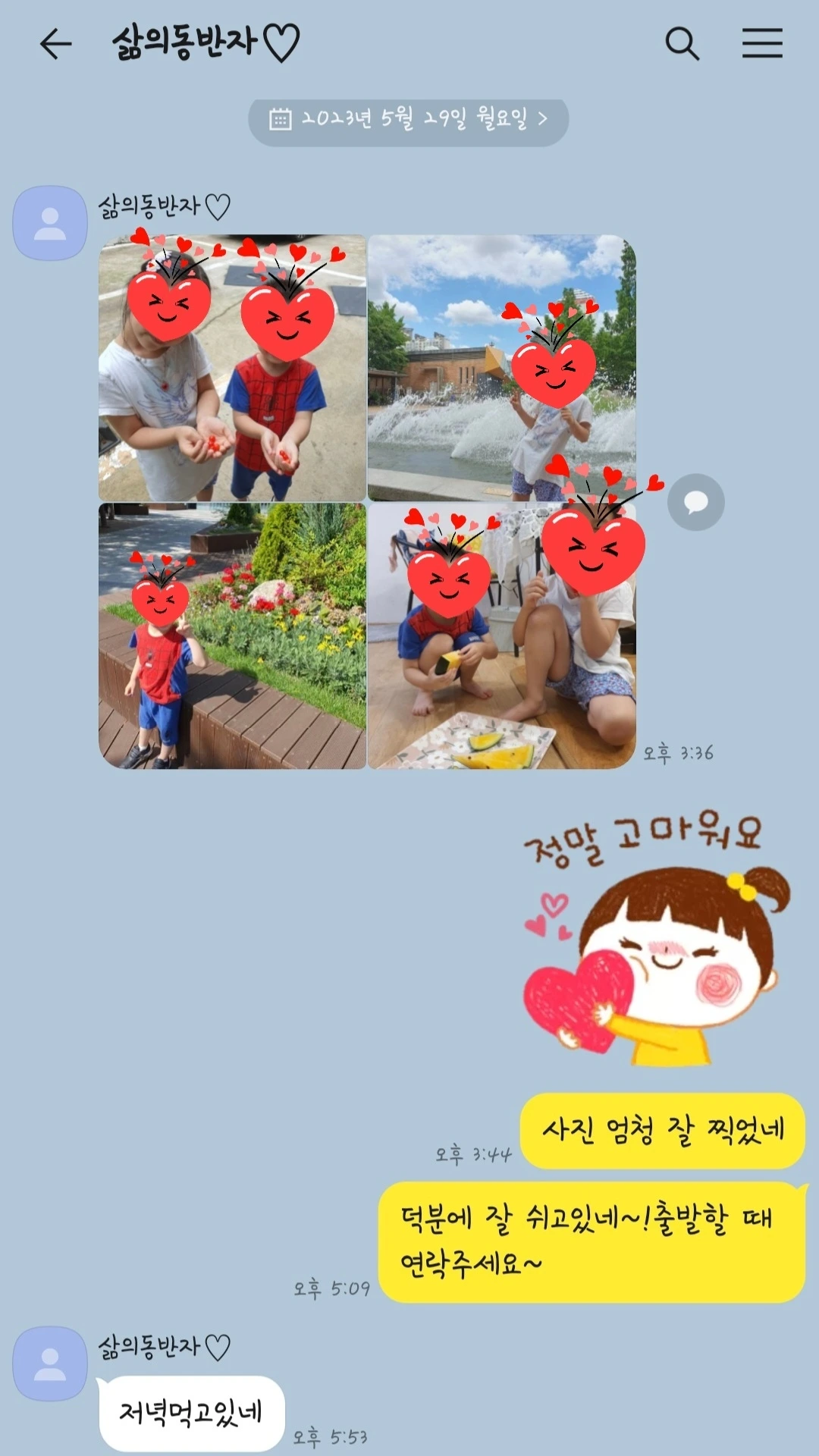 놀랍게도 몇 시간 만에 위에 적어놓은 목록 안의 일들을 모두 했다. 애써서 한 것도 아니고, 게으름을 한껏 부린 느낌인데 무언가 뿌듯하게 몸마음이 차오른다. 신랑이 아이들이 즐겁게 놀고 있는 사진을 보내줘서 더 편하게 쉬게 된다. 신랑에게 출발할 때 연락을 달라고하자, 저녁을 먹고 온다길래 또 한 번의 내적댄스를 추고 숨을 고른다.