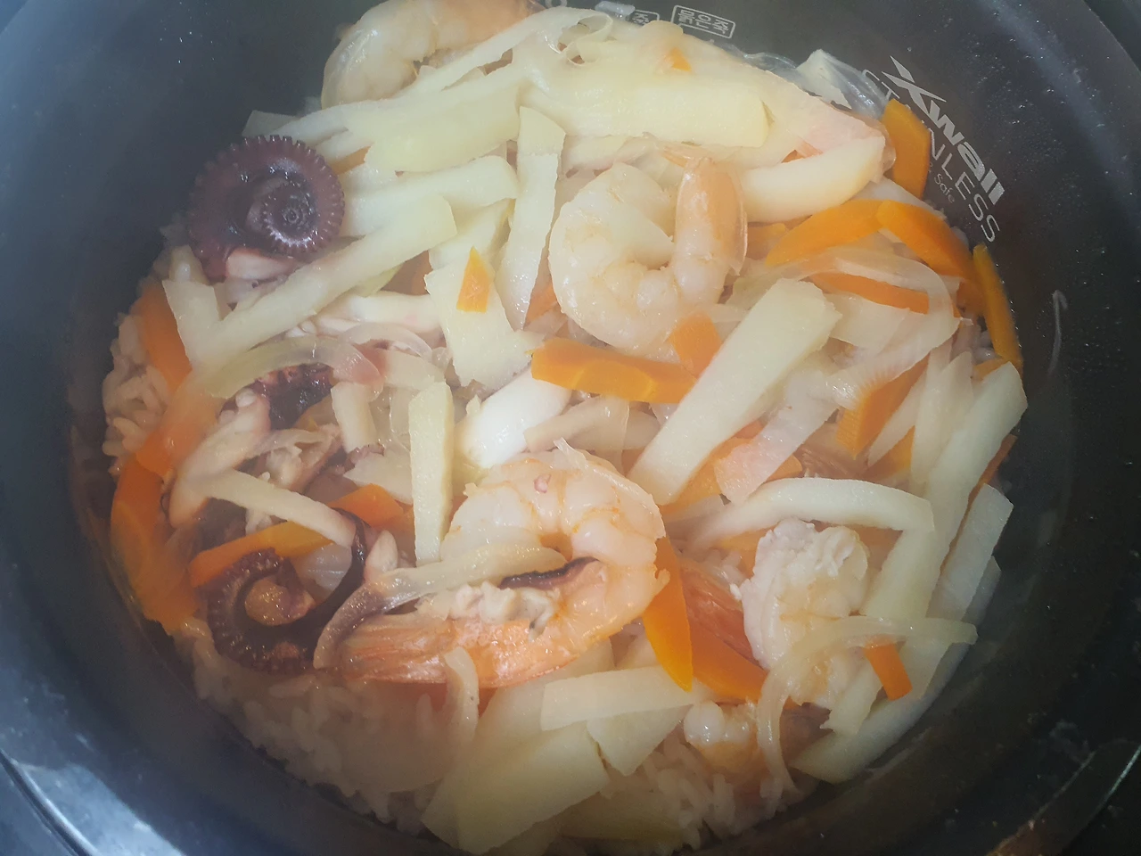 밥은 <기적의 집밥책>에서 본 레시피를 응용해서 다시마를 넣고 불린 쌀에 문어, 새우, 감자, 양파, 당근을 양념해서(간장. 미림. 참기름을 같은 비율로) 올려 밥솥에다 지었다.
