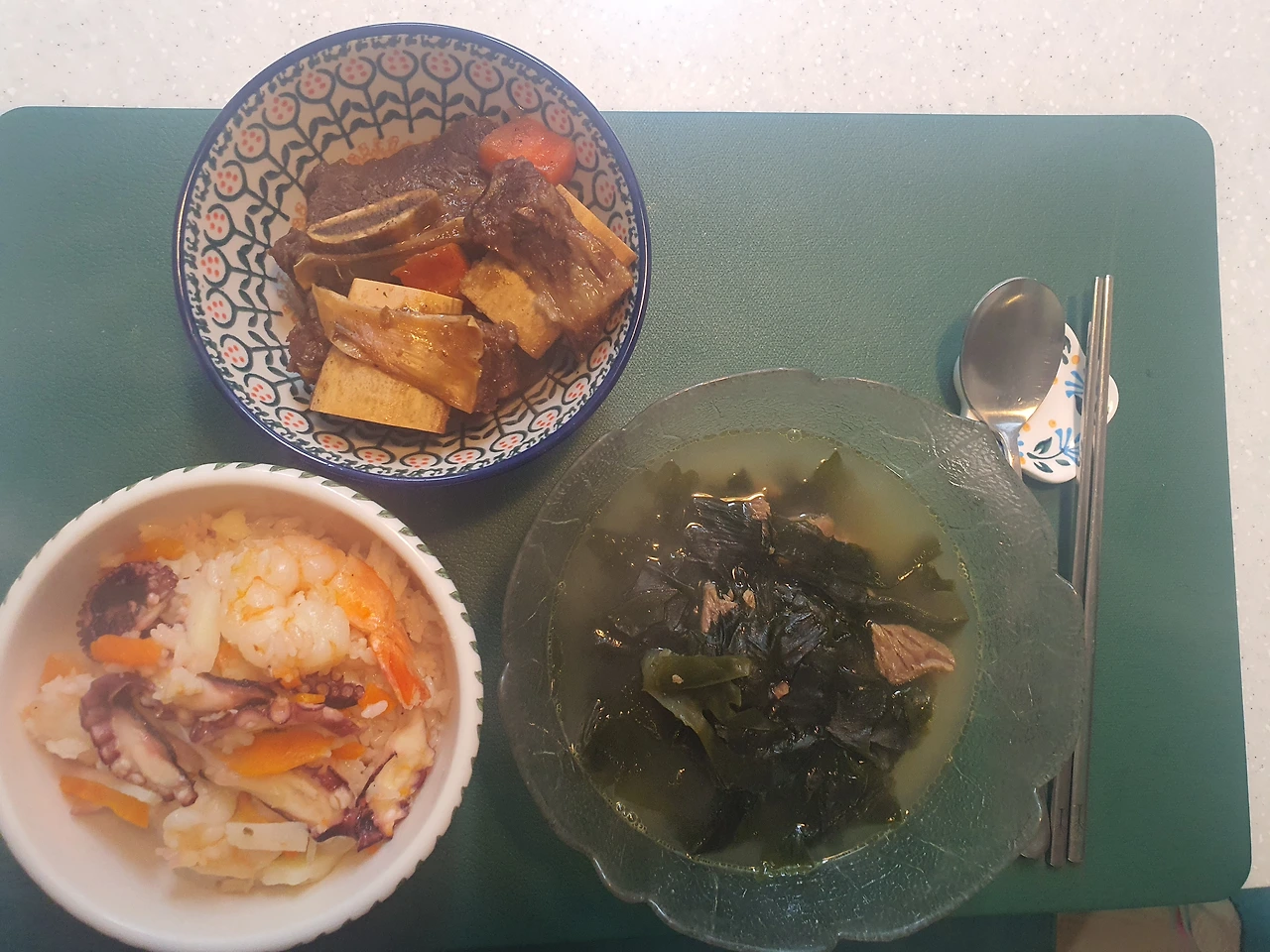 신랑 생일을 맞아 생일상을 차린다. 힘들게 너무 많은 것을 하지 말라고 해서, 좋아하는 것들로만 준비했다. 생일날엔 미역국이 맛있어야 한다. 집 근처 생협 직원분께 배운 비법인데, 국거리용 소고기를 덩어리째 한 시간 끓여서 고기는 찢어 넣고 그 육수로 미역국을 끓이면 진짜 맛있다!(일반 미역국 끓일 때는 간장과 멸치 액젓 간을 하면 더 깊은 맛이 난다)