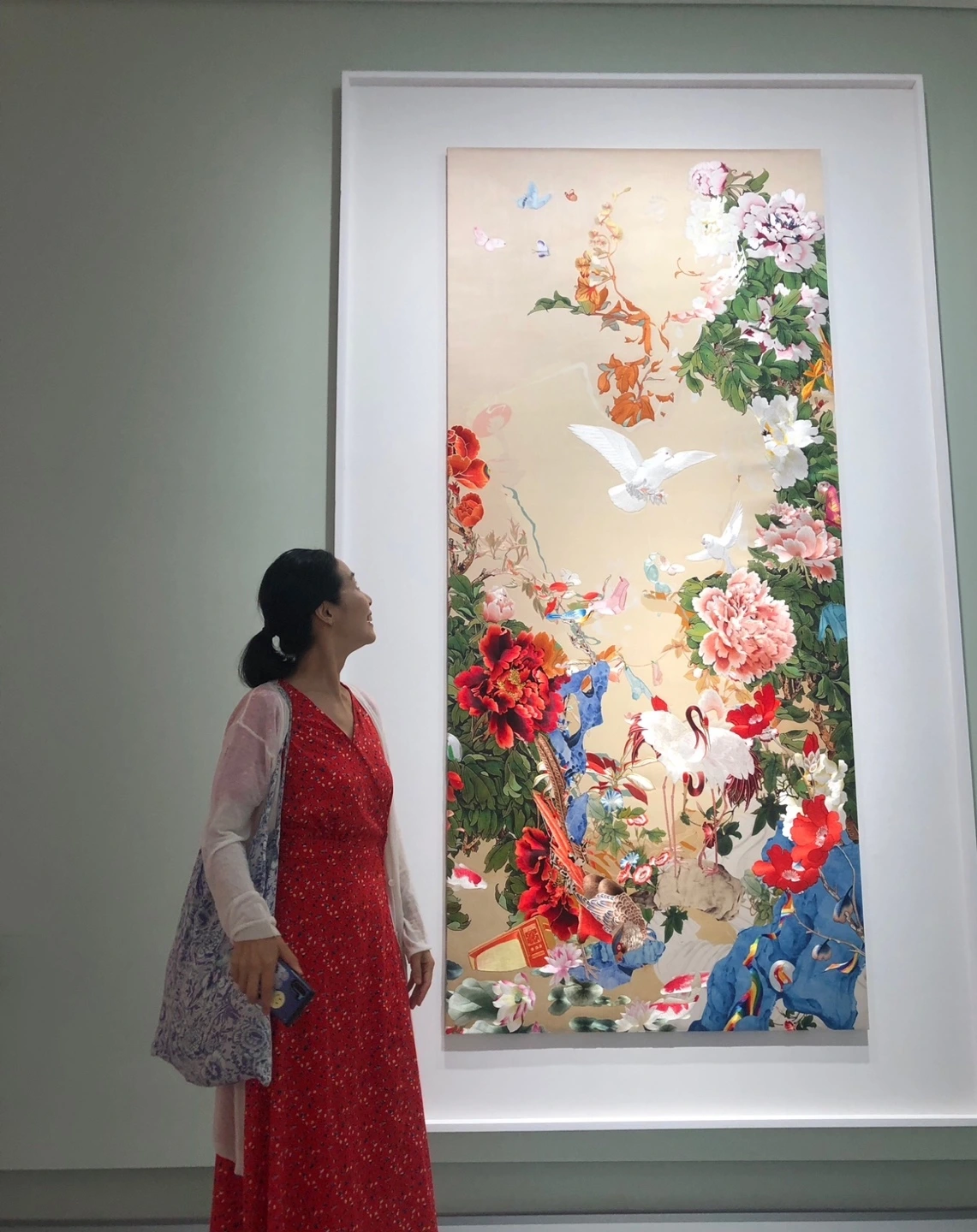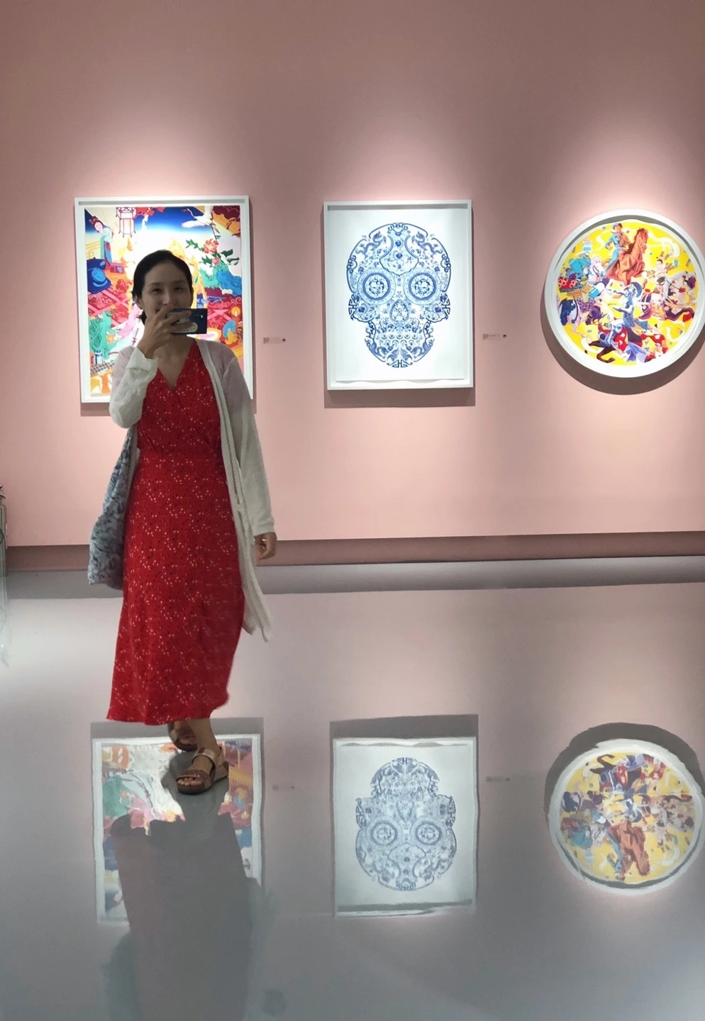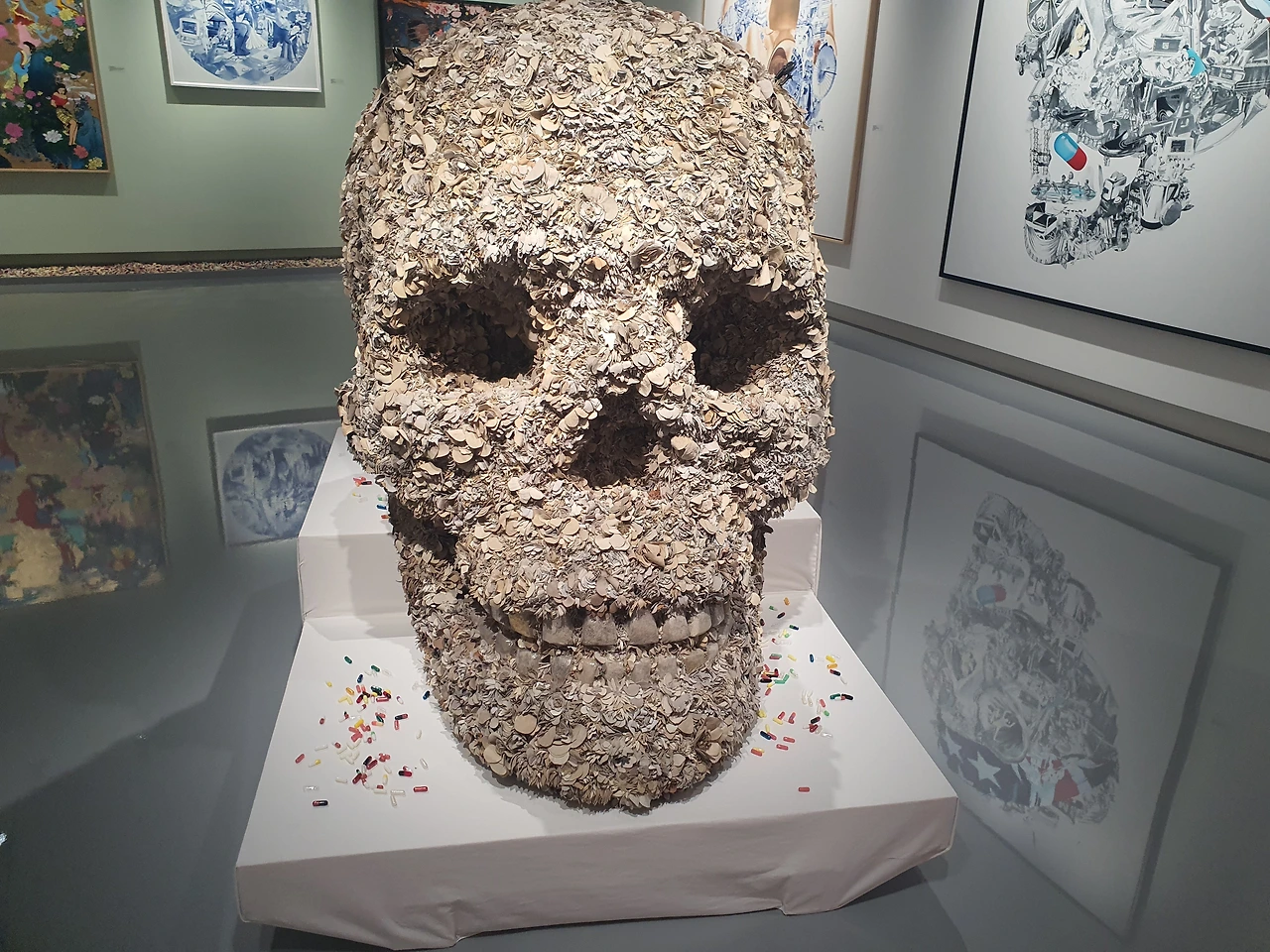 1층 전시장엔 런던에서 활동하는 중국 화가인 재키 차이의 작품들이 있었다. 중국 특유의 색감과 전통 세밀화 느낌에 현대적 감각이 섞여있어 묘한 매력이 있었다. 무엇보다 가죽으로 만든 꽃들로 만들어진 커다란 해골이 눈에 확 띄었다. 해골 그림도 다양하고 어디선가 본 듯한 느낌이 들었는데 알고 보니 알렉산더 맥퀸이라는 브랜드와 협업한 작가였다. 해골 조형물과 전시장엔 알약들이 깔려있었고, 슈퍼맨이 코로나 검사를 받는 재미난 콘셉트의 그림도 있었다. 코로나 시기의 힘든 투쟁을 예술로 승화한 것에 또 한 번 놀랐다.