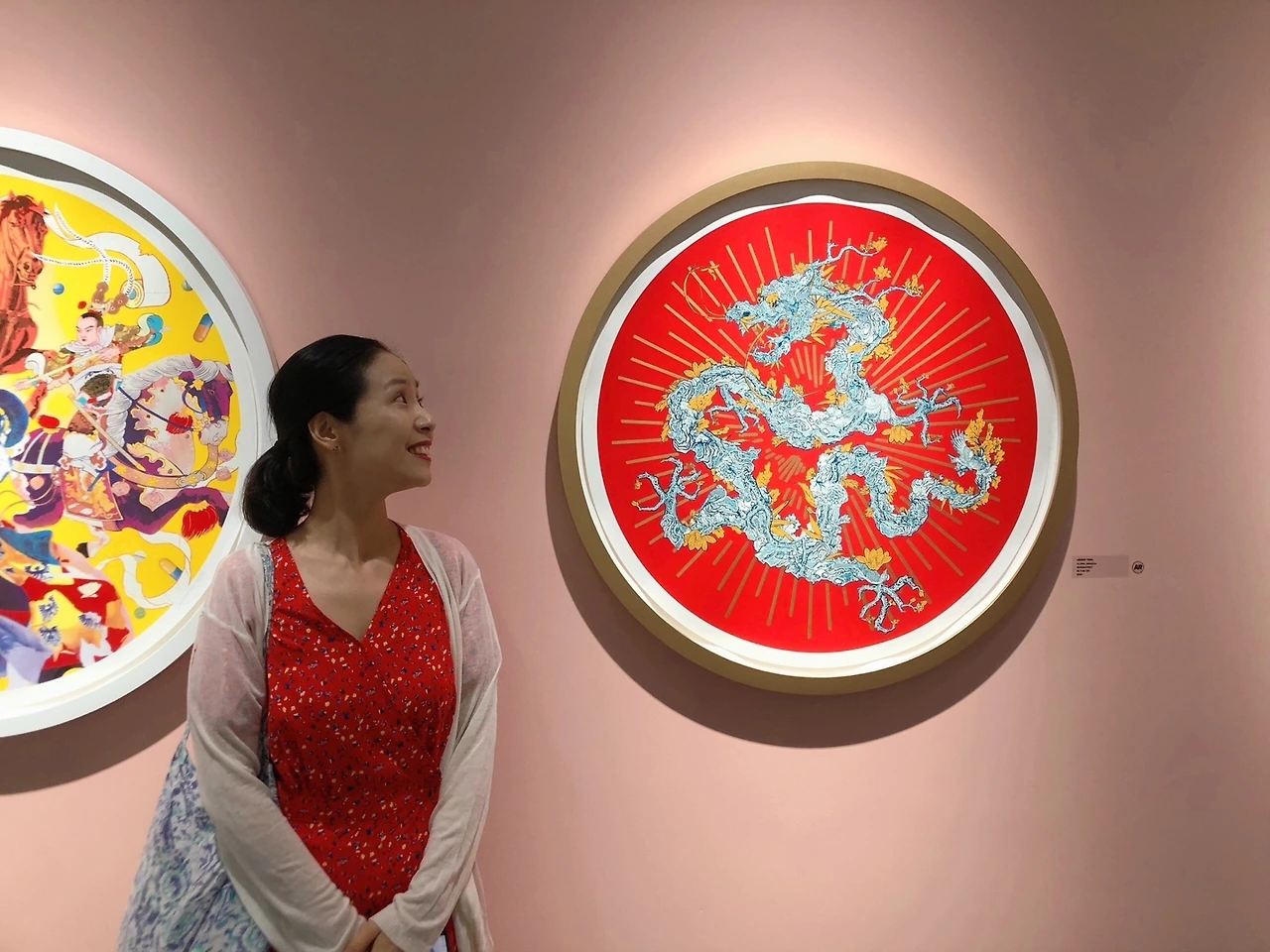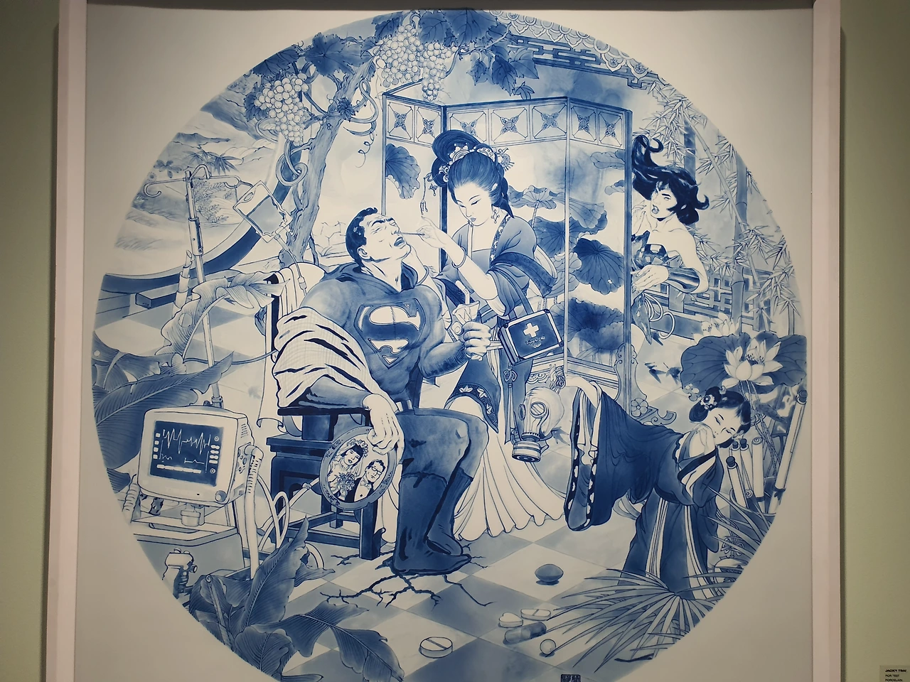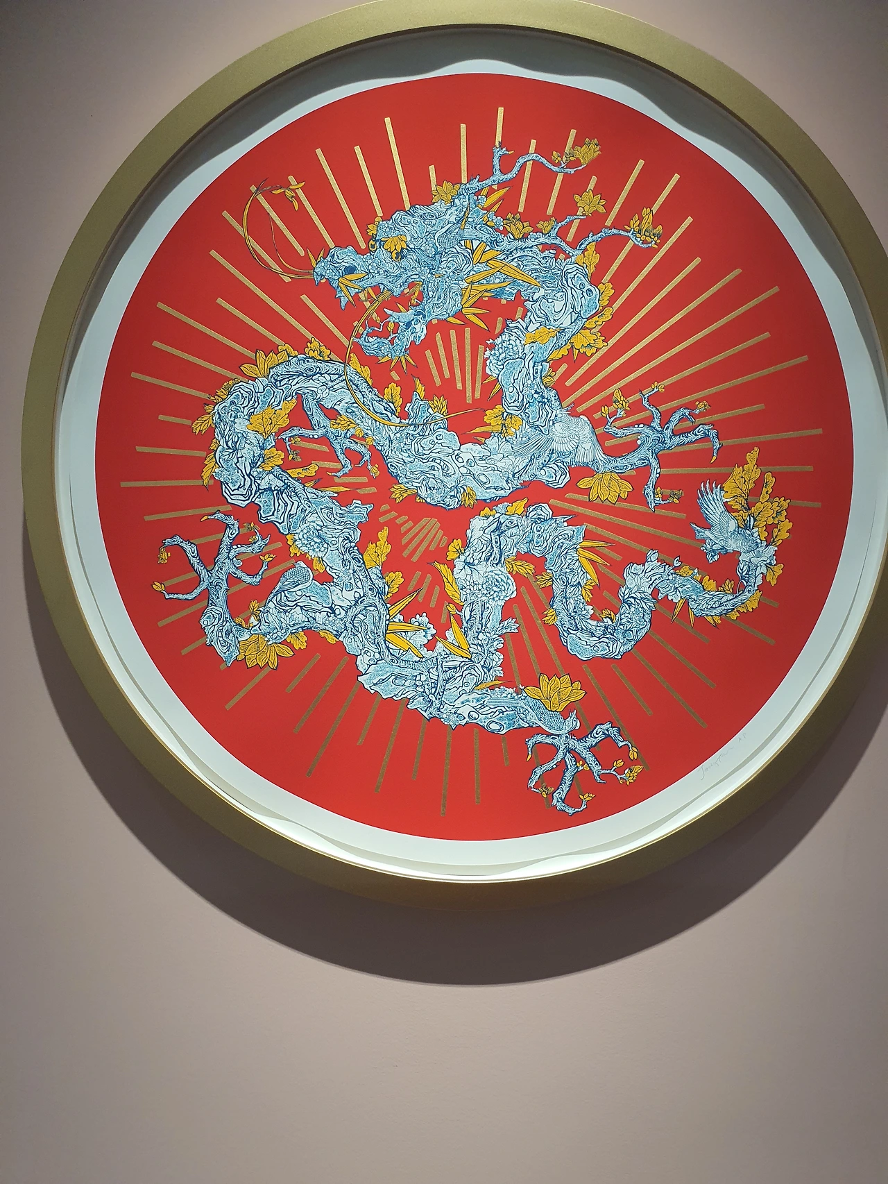 1층 전시장엔 런던에서 활동하는 중국 화가인 재키 차이의 작품들이 있었다. 중국 특유의 색감과 전통 세밀화 느낌에 현대적 감각이 섞여있어 묘한 매력이 있었다. 무엇보다 가죽으로 만든 꽃들로 만들어진 커다란 해골이 눈에 확 띄었다. 해골 그림도 다양하고 어디선가 본 듯한 느낌이 들었는데 알고 보니 알렉산더 맥퀸이라는 브랜드와 협업한 작가였다. 해골 조형물과 전시장엔 알약들이 깔려있었고, 슈퍼맨이 코로나 검사를 받는 재미난 콘셉트의 그림도 있었다. 코로나 시기의 힘든 투쟁을 예술로 승화한 것에 또 한 번 놀랐다.