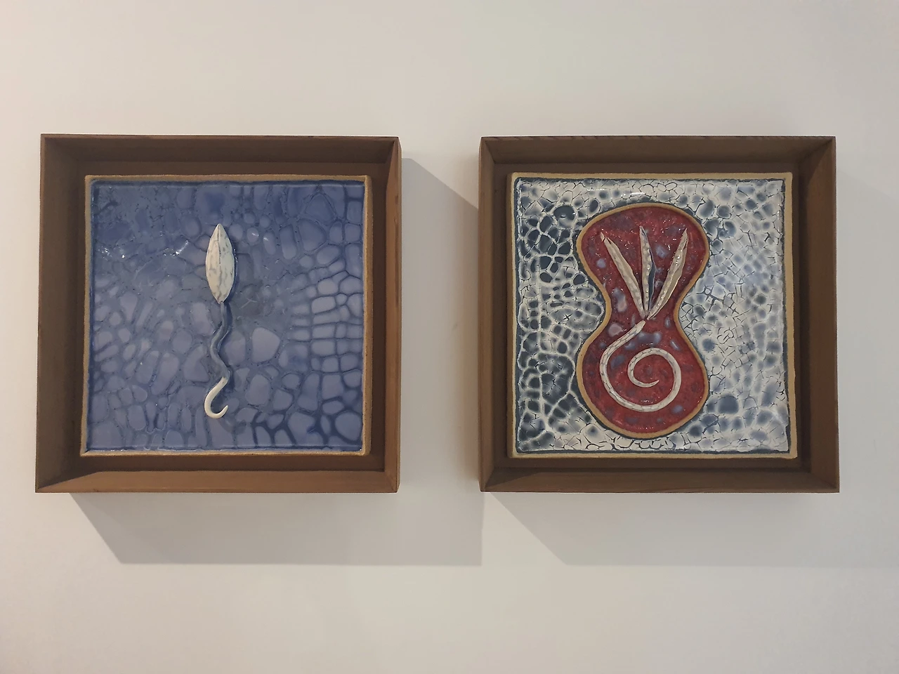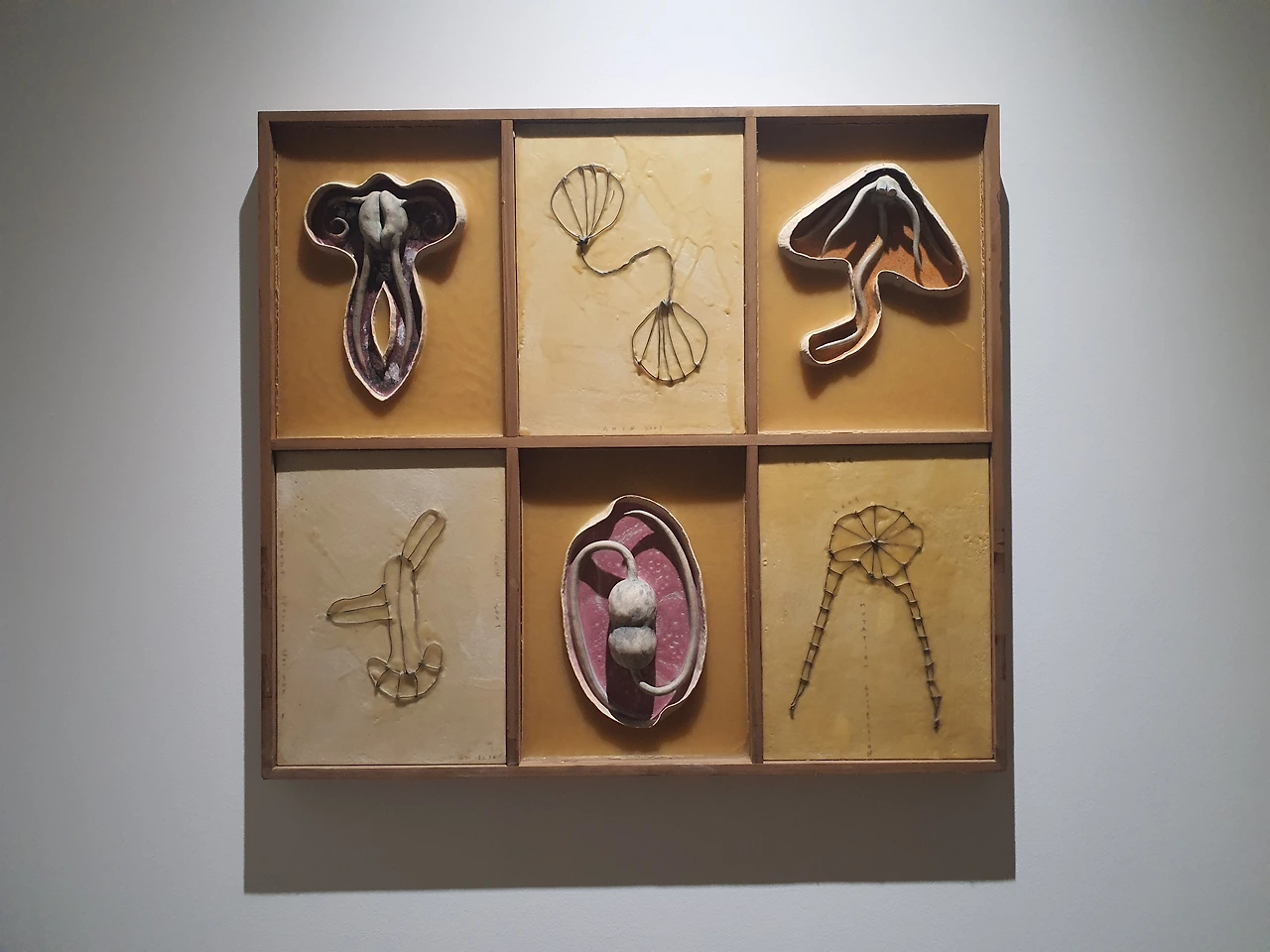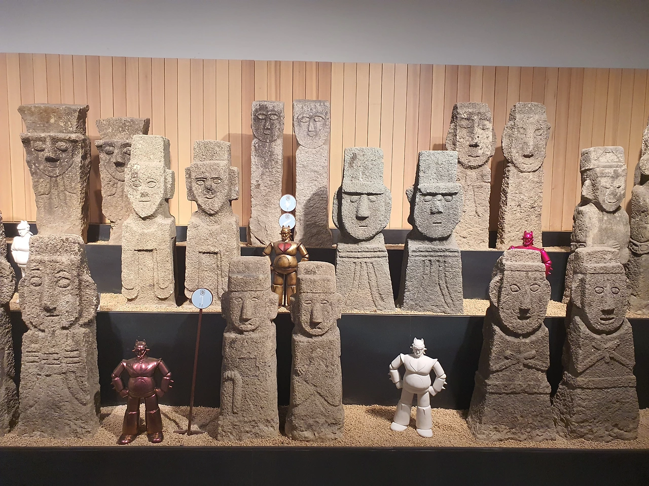 2층 두 번째 전시장에서는 또 한 번 감탄이 나왔는데, 실내에 가득한 과거의 석상들에 원색의 현대 미술작품들이 섞여 있어 굉장히 다채로운 분위기가 느껴졌다. 특히 로봇 태권브이 같은 원색 모형이 너무나 인상적이었다. 작가님의 작품은 원형적이고 원시적인 상징들을 캔버스에 입체적으로 표현한 것이 참 좋았다.